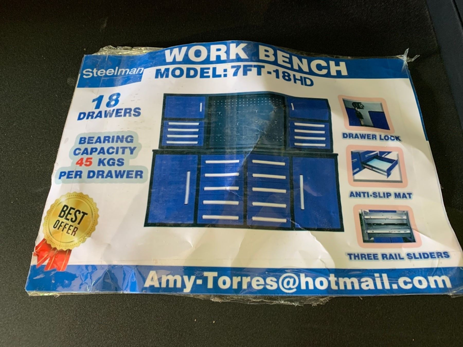 2020 STEELMAN BLUE 7FT WORK BENCH WITH 18 LOCKING DRAWERS 87"W X 23"D X 67"H WITH HUTCH