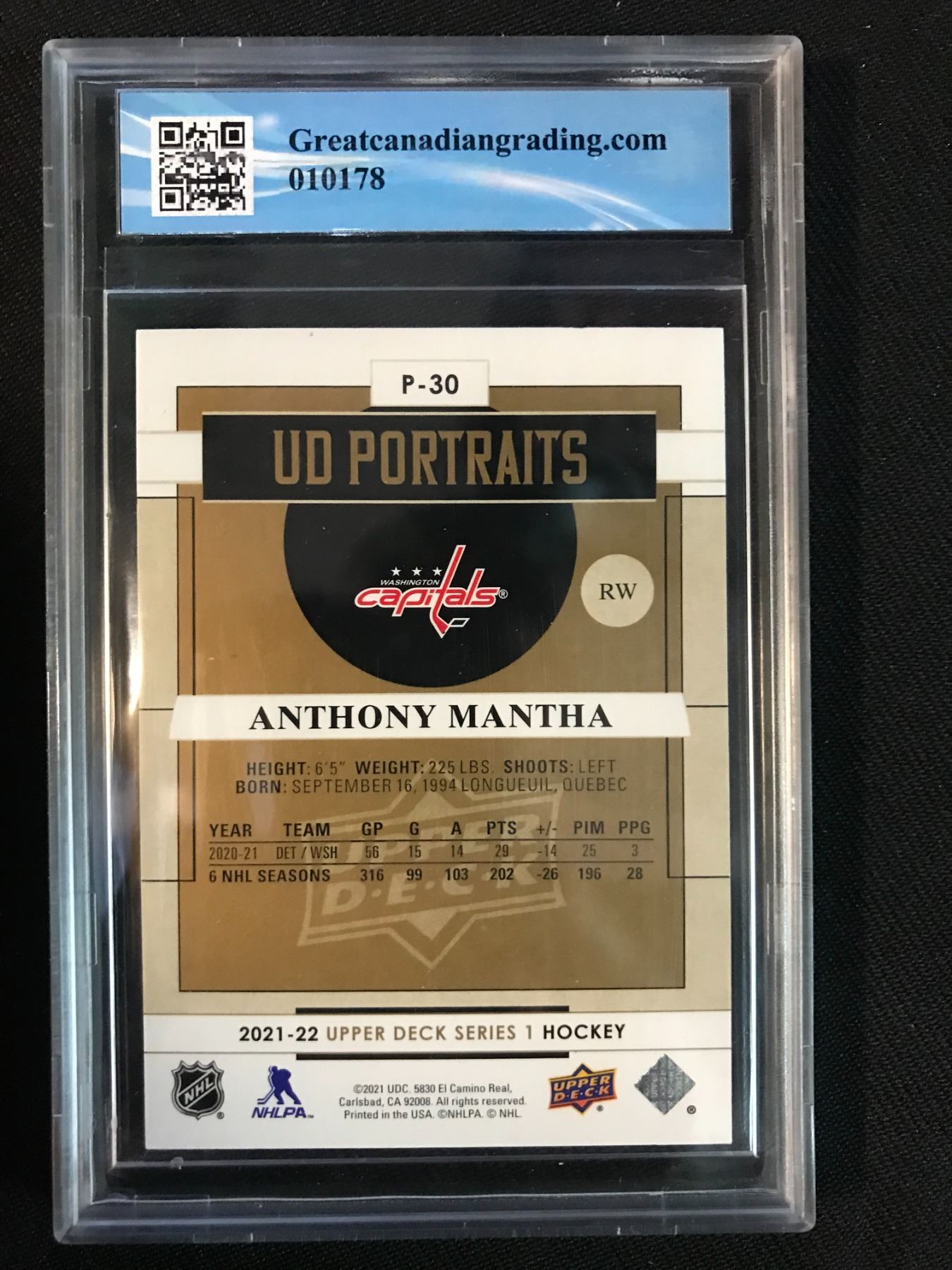 2021-22 UD PORTRAITS NO.P-30 ANTHONY MANTHA LIMITED EDITION 152/250 (GCG 9)