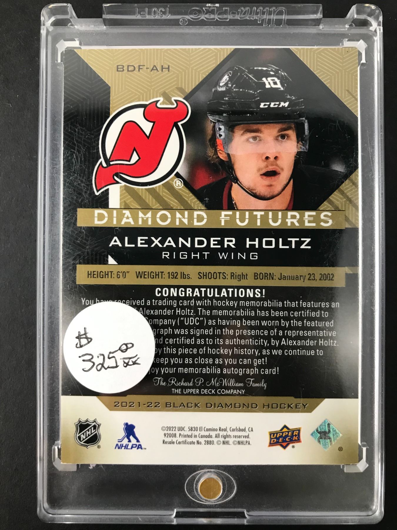 2021-22 UPPER DECK BLACK DIAMOND ALEXANDER HOLTZ DIAMOND FUTURES ROOKIE PATCH AUTO 23/25