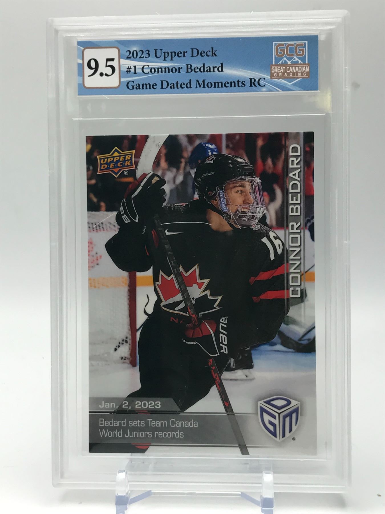 2023 UPPER DECK #1 CONNOR BEDARD GAME DATED MOMENTS RC  GCG GRADED 9.5