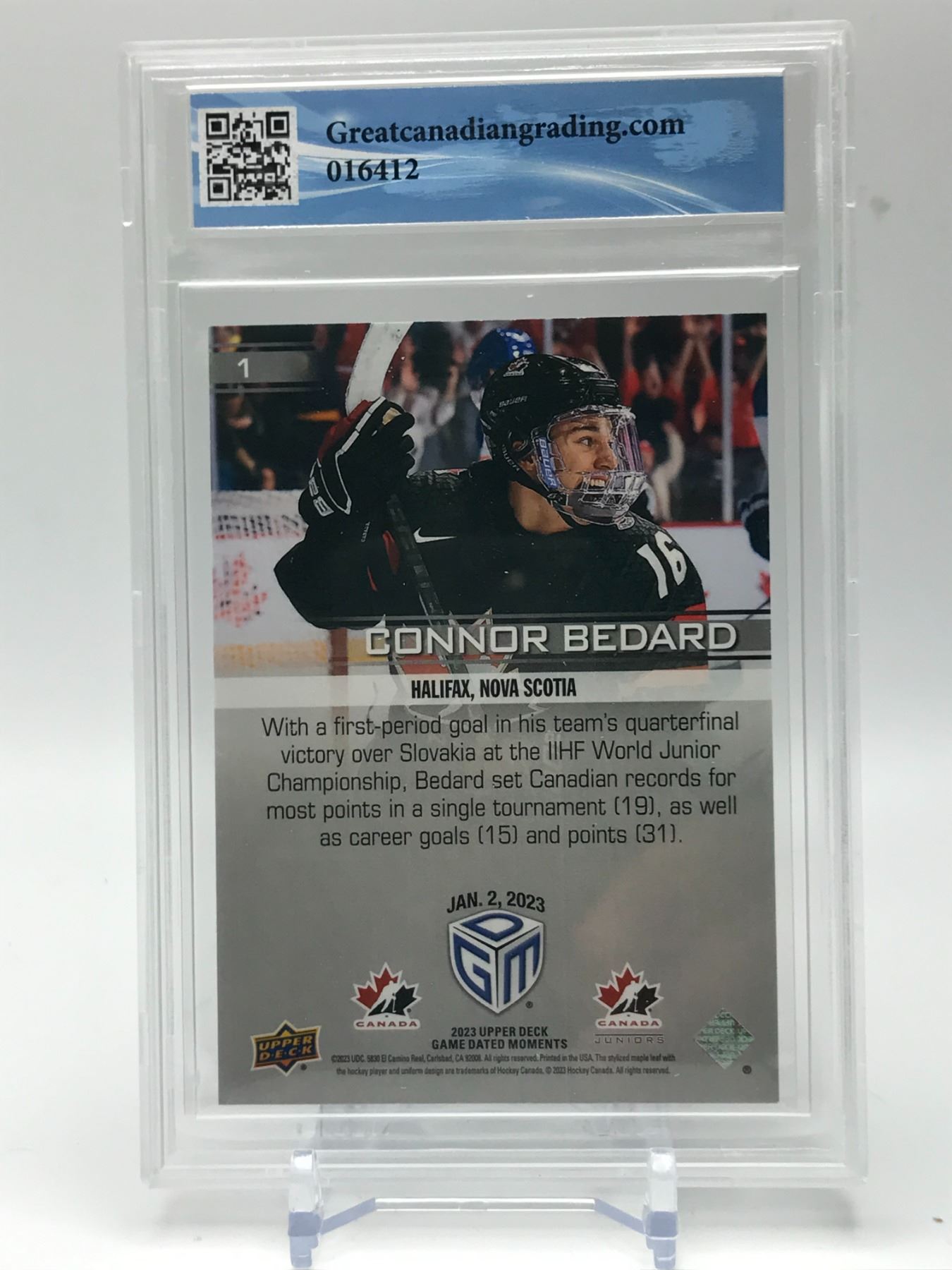 2023 UPPER DECK #1 CONNOR BEDARD GAME DATED MOMENTS RC GCG GRADED 9.5