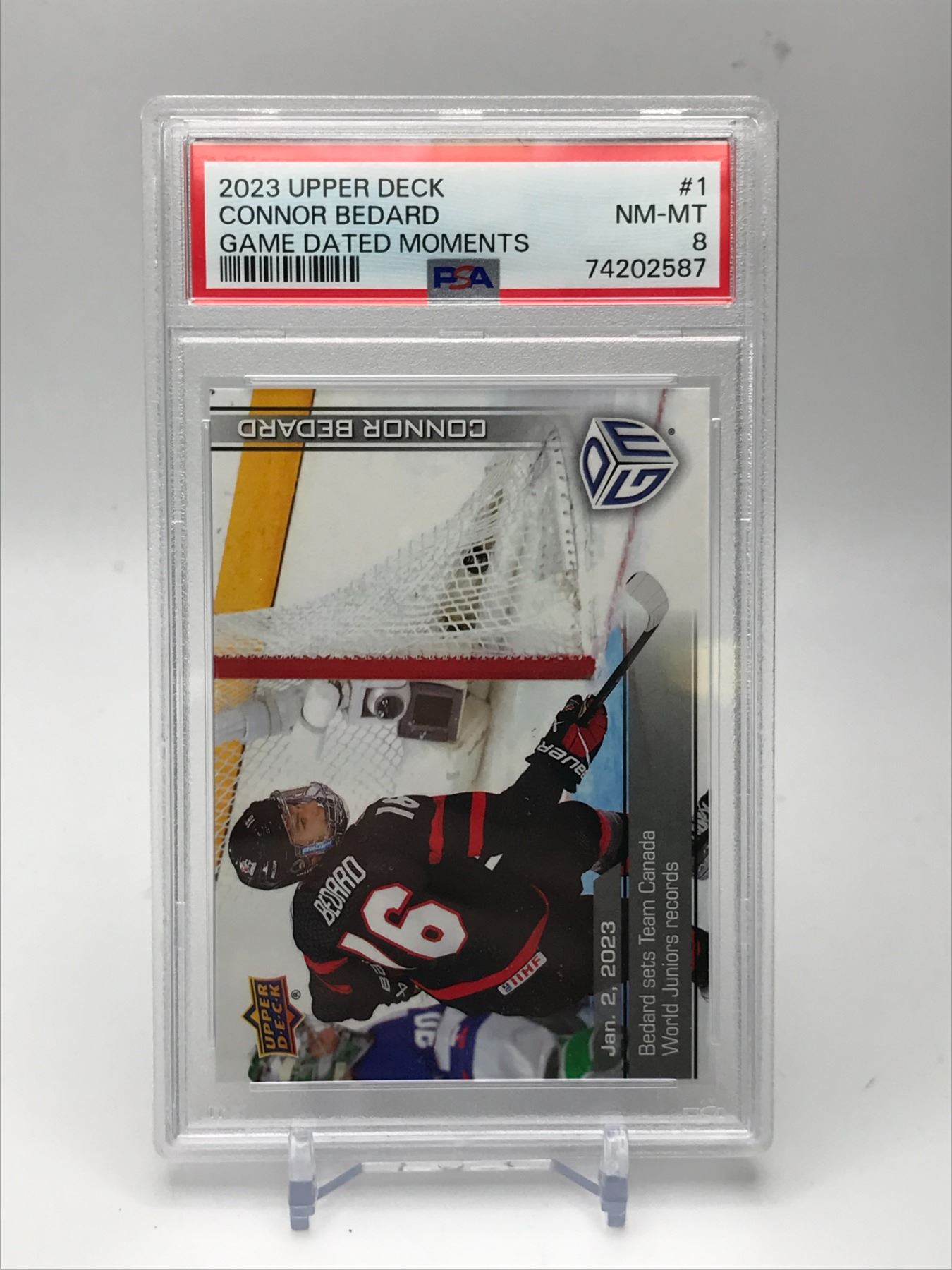 2023 UPPER DECK GAME DATED MOMENTS CONNOR BEDARD PSA 8