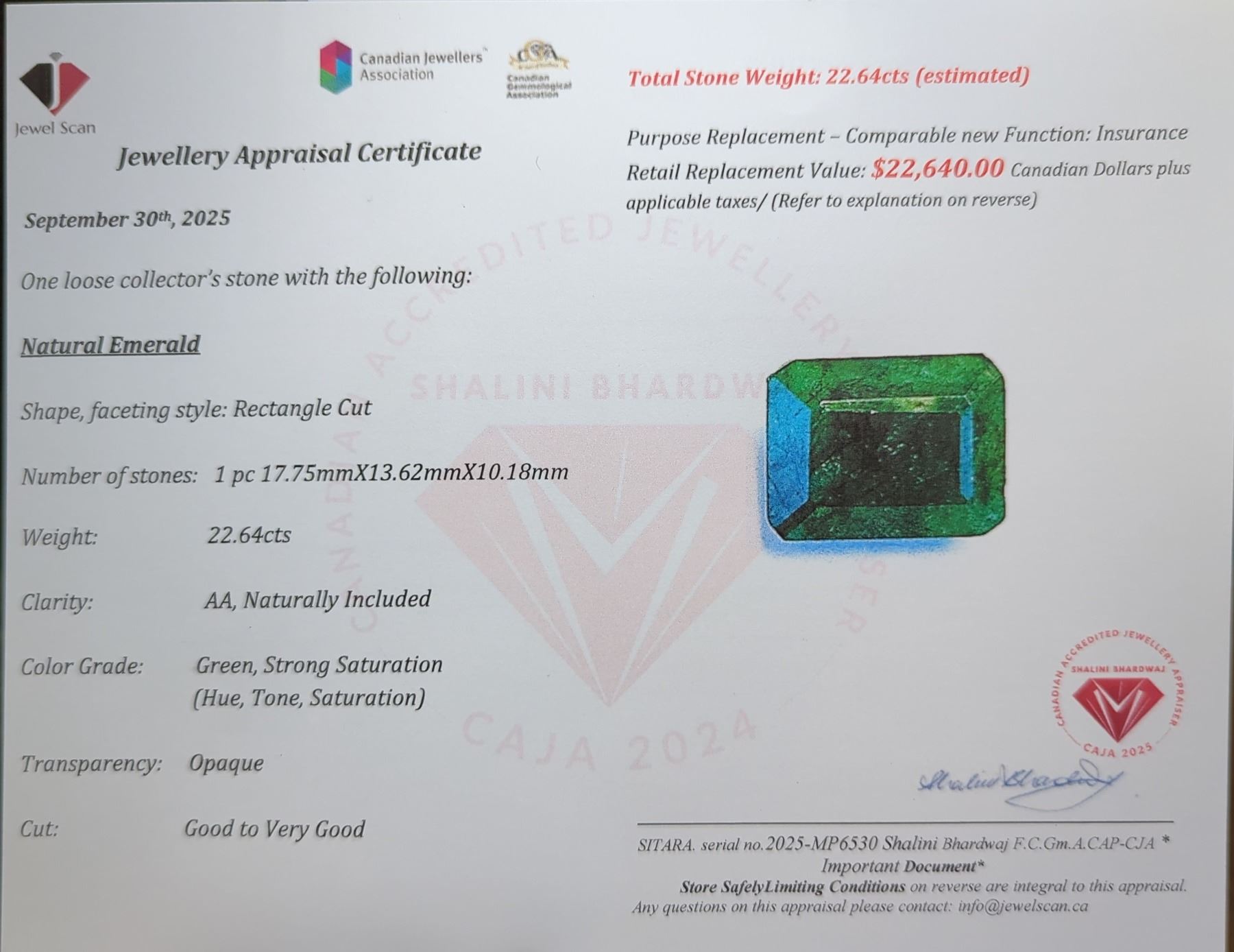 22.64 ct Certified Emerald gemstone ($22,640 Appraisal)