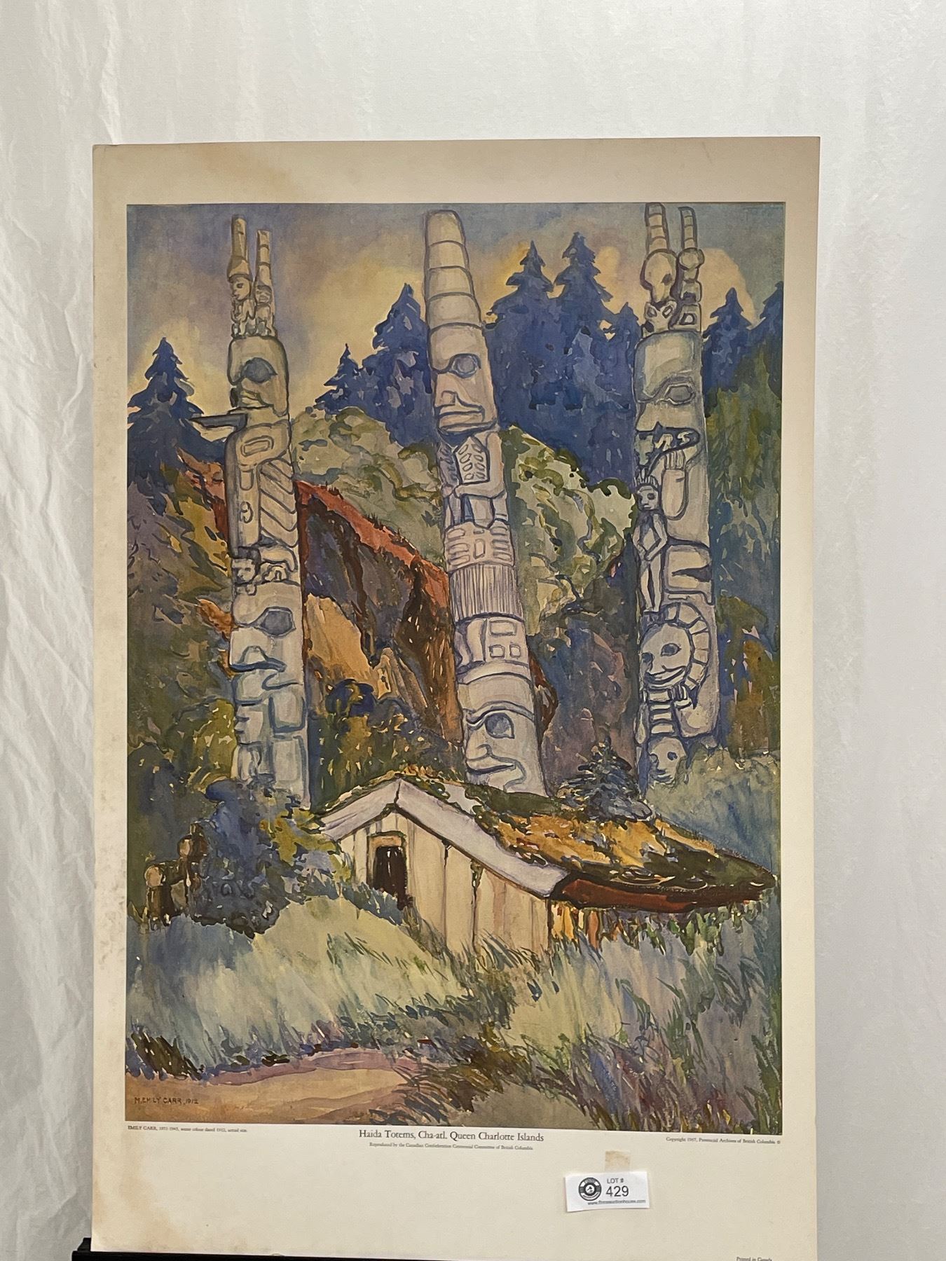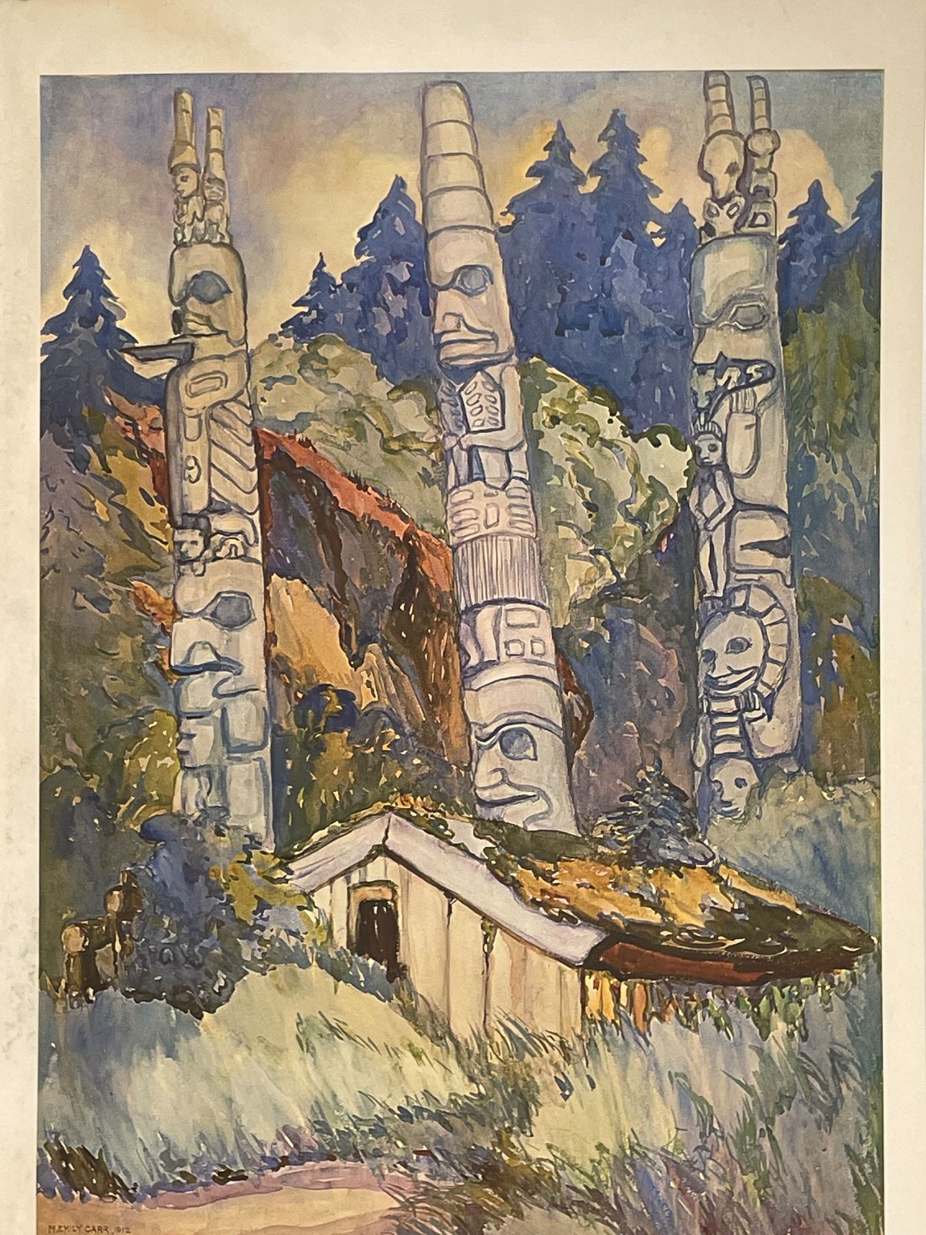 22 by 34 1967 Re-Print Copy of an Emily Carr Painting 1912 Haida Totems Queen Charlotte Islands
