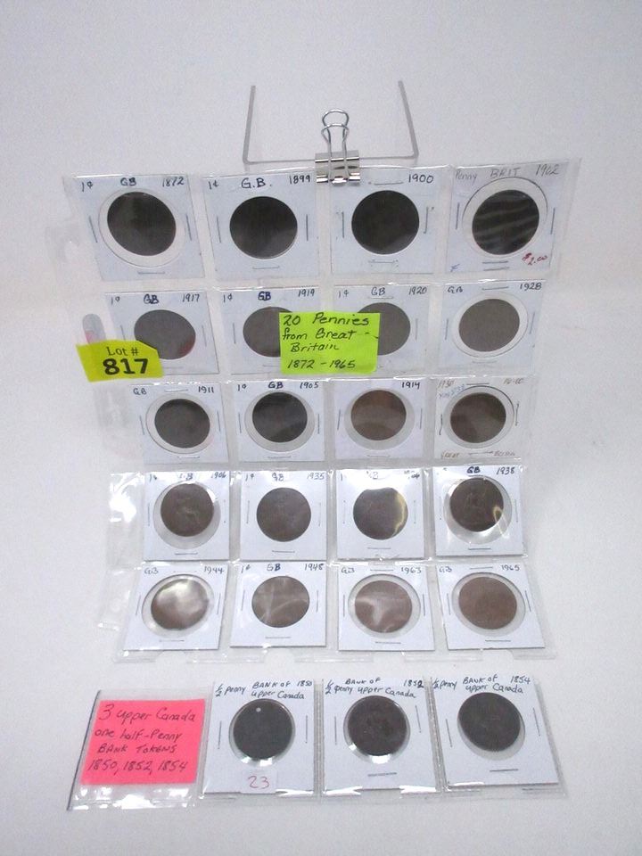 20 Great Britain Pennies range from 1872 to 1965. 3 Bank of Upper Canada Half-Pennies are 1850, 1852, and 1854.