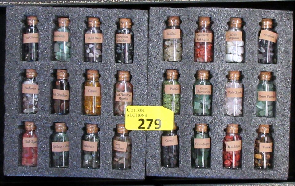 24 Different stones in 24 mm x 48 mm bottles. Tiger's Eye, Amethyst, Aquamarine, Labradorite, Peridot, Bloodstone and more. Approximately 400 CTW.