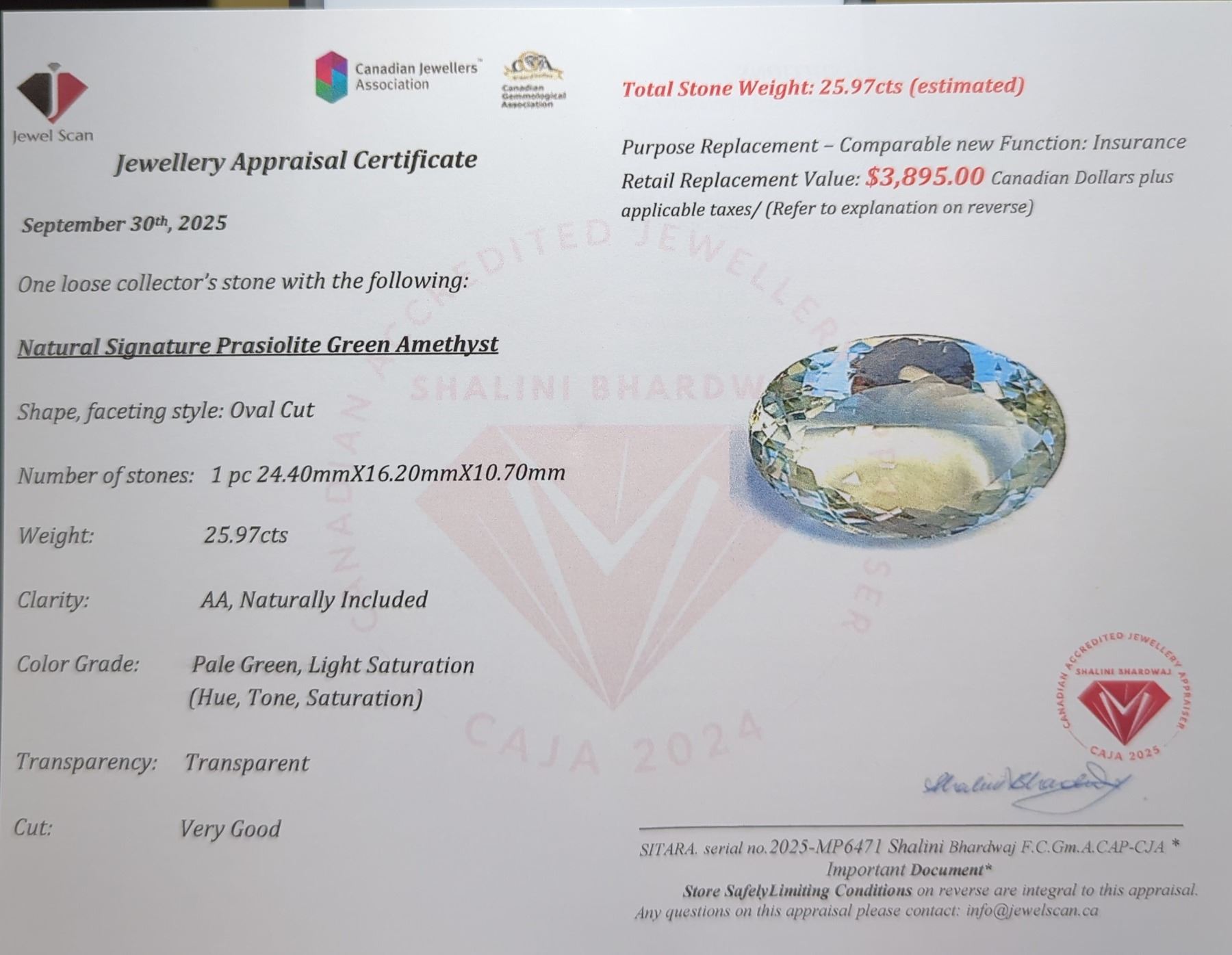 25.97 ct Certified Green Prasiolite gemstone ($3,895 Appraisal)