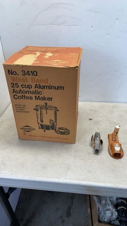 25 CUP COFFEE URN AND VINTAGE MULTITOOL WITH LEATHER POUCH