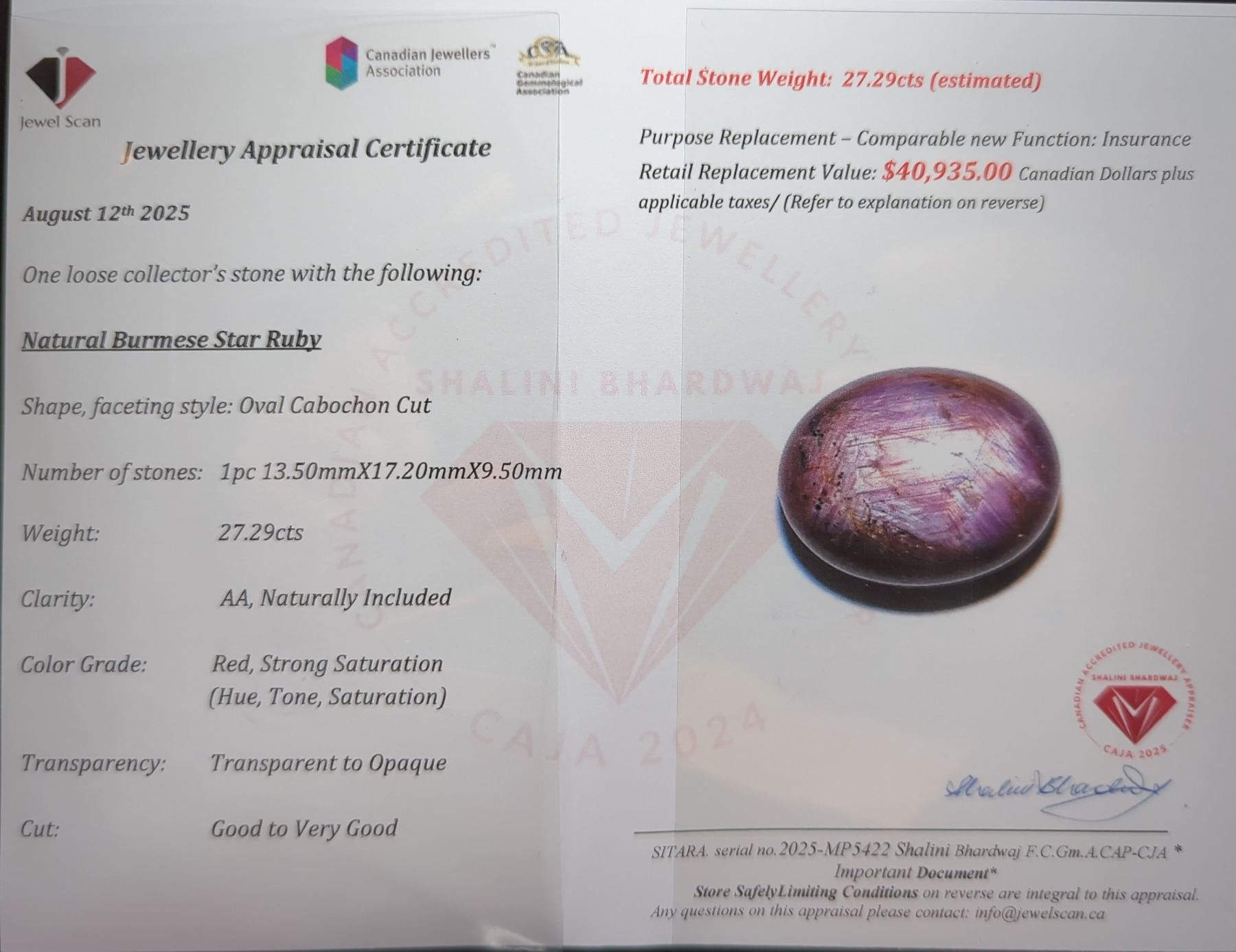 27.29 ct Certified Red Star Ruby gemstone ($40,935 Appraisal)