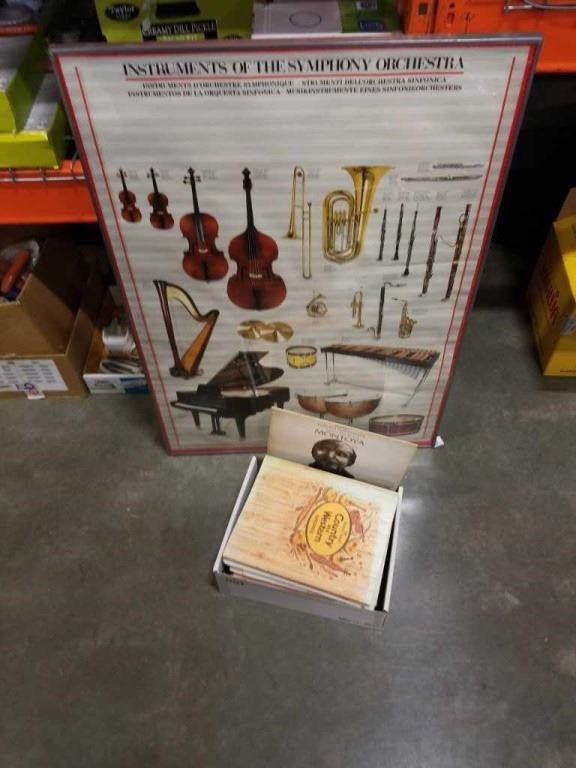 27" X 39" FRAMED ORCHESTRA MUSIC INSTRUMENTS WITH BOX OF MUSIC BOOKS