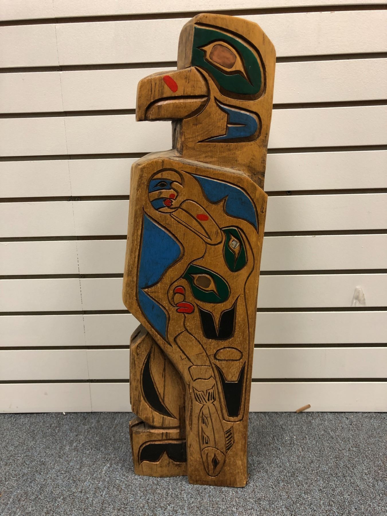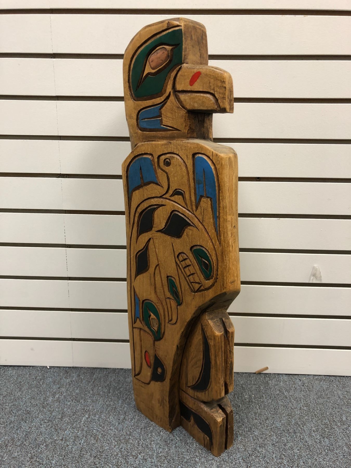 28 1/2in West Coast First Nations carved wooden totem "Eagle/ Killer Whale/ Raven" w/ copper & abalone accents signed Telqua 1997