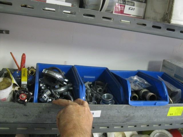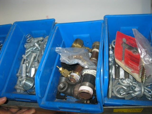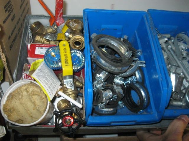 28"X10" STEEL TRAY WITH VARIOUS FASTNERS, CUSHION CLAMPS, VALVES