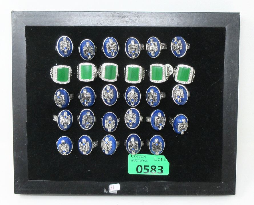 Jade glass rings have a 1" face and are size 11. Cabochon style rings are size 8-10.
