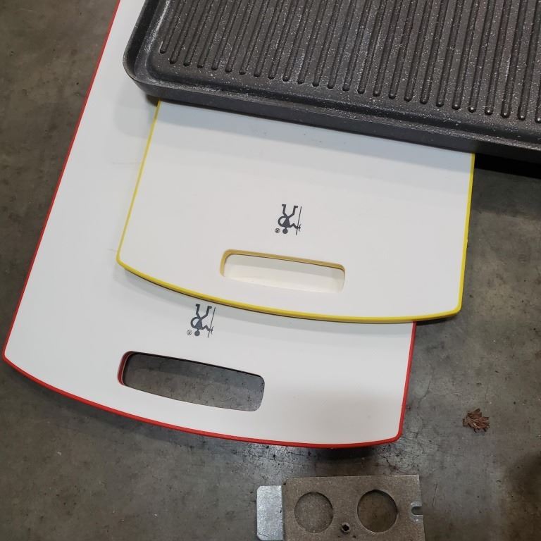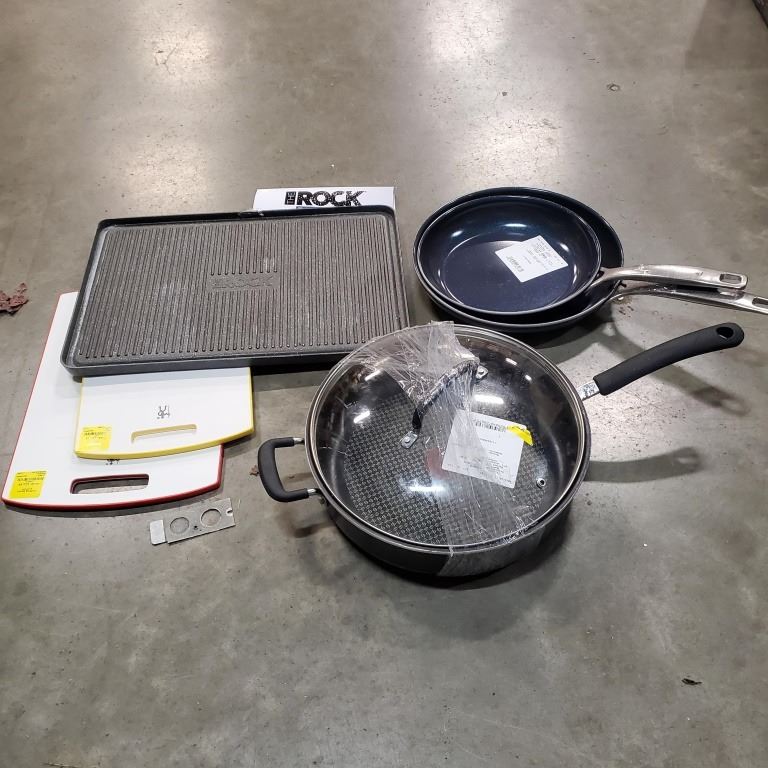 2JA Henkels cutting boards, Rock Griddle, Blue Diamond pans and Tfal sauce pan with lid