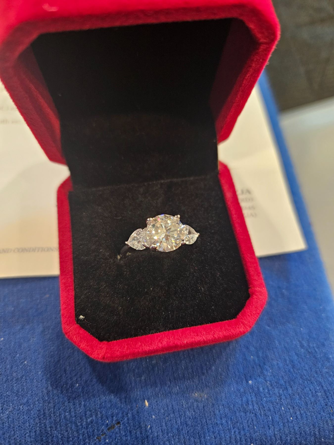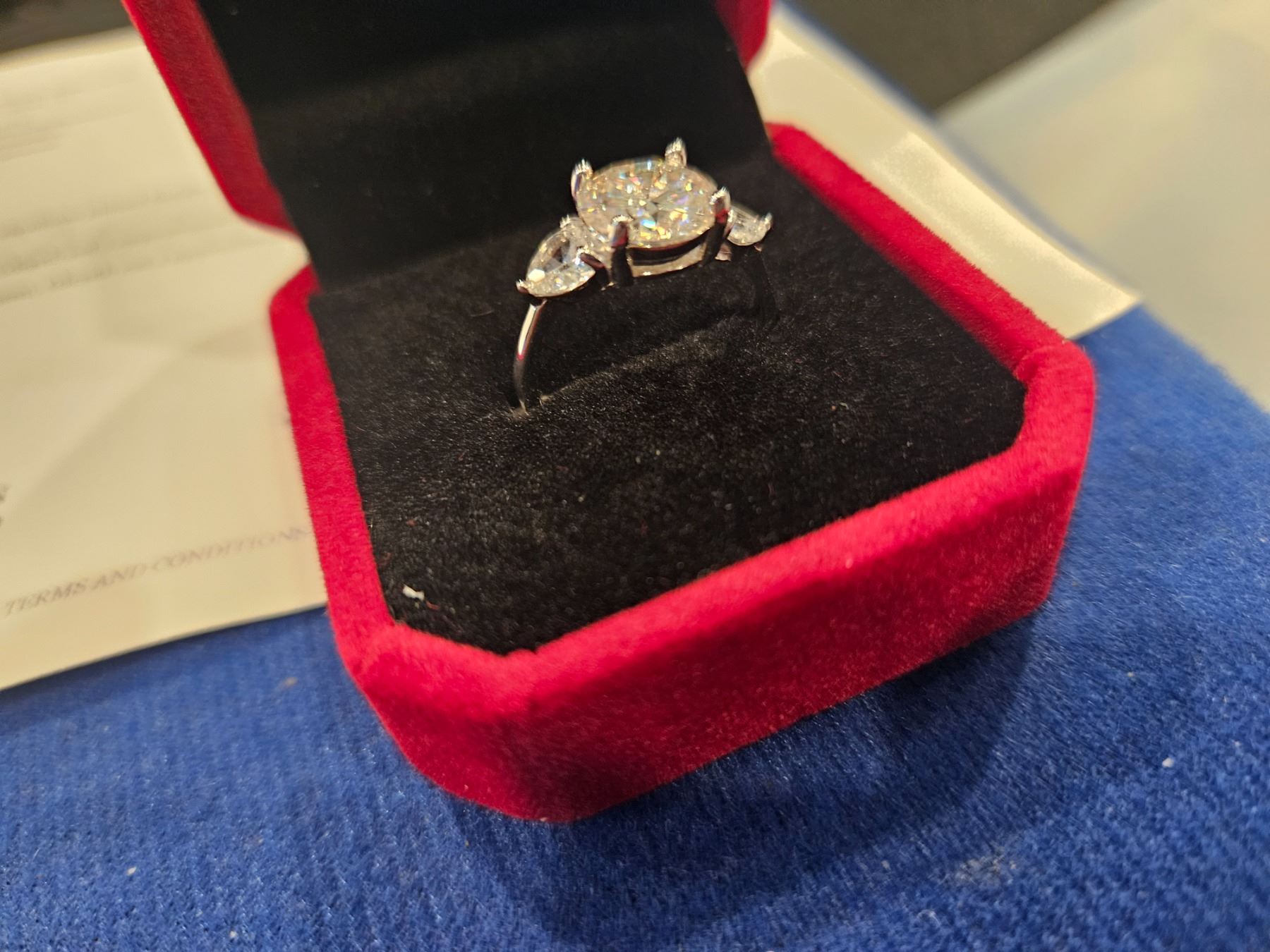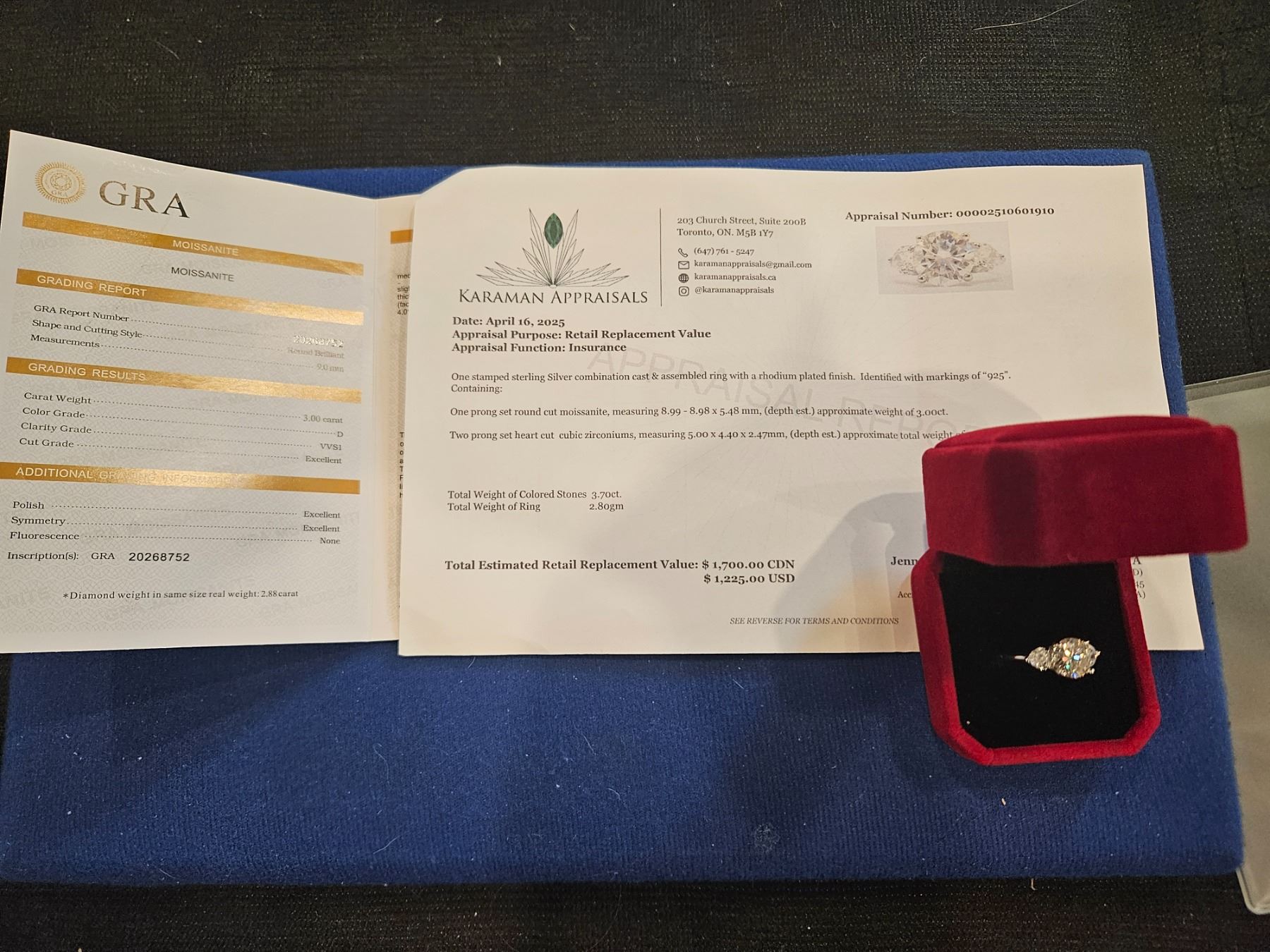 3.00 CT GRA CERTIFIED ROUND BRILLIANT CUT MOISSANITE STONE VVS D COLOR WITH HEART SHAPED CUBIC ZIRCONIA SET ON EITHER SIDE SET IN 925 SILVER RING SIZE 7 RETAIL VALUE $1,700.00