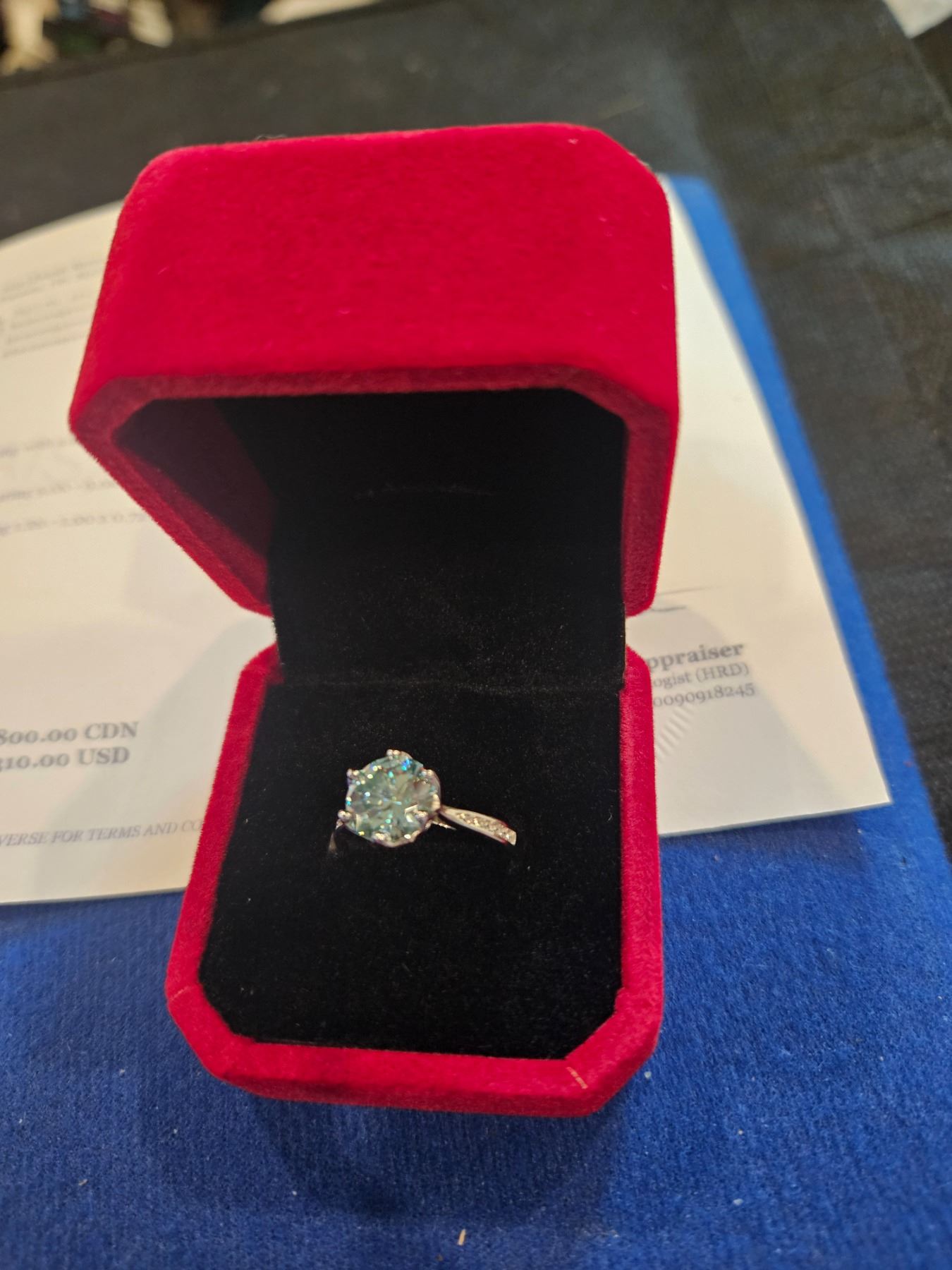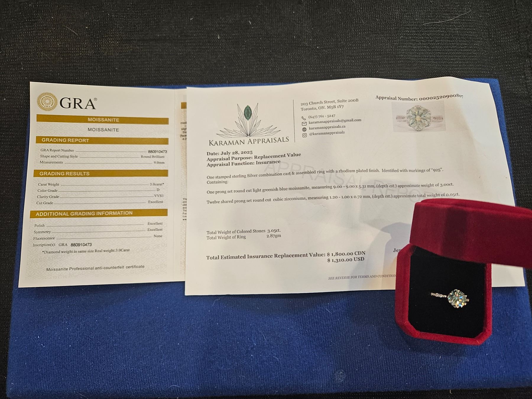 3.00 CT GRA CERTIFIED ROUND BRILLIANT CUT MOISSANITE STONE VVS LIGHT GREENISH BLUE COLOR WITH 12 ROUND BRILLIANT CUT CUBIC ZIRCONIA SET IN SHANKS SET IN 925 SILVER RING SIZE 7 RETAIL VALUE $1,800.00