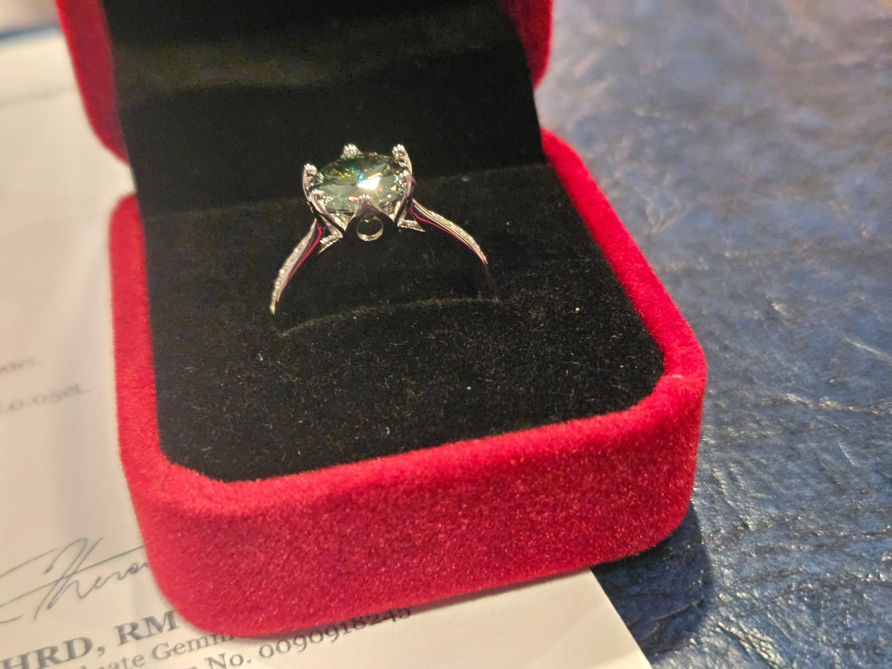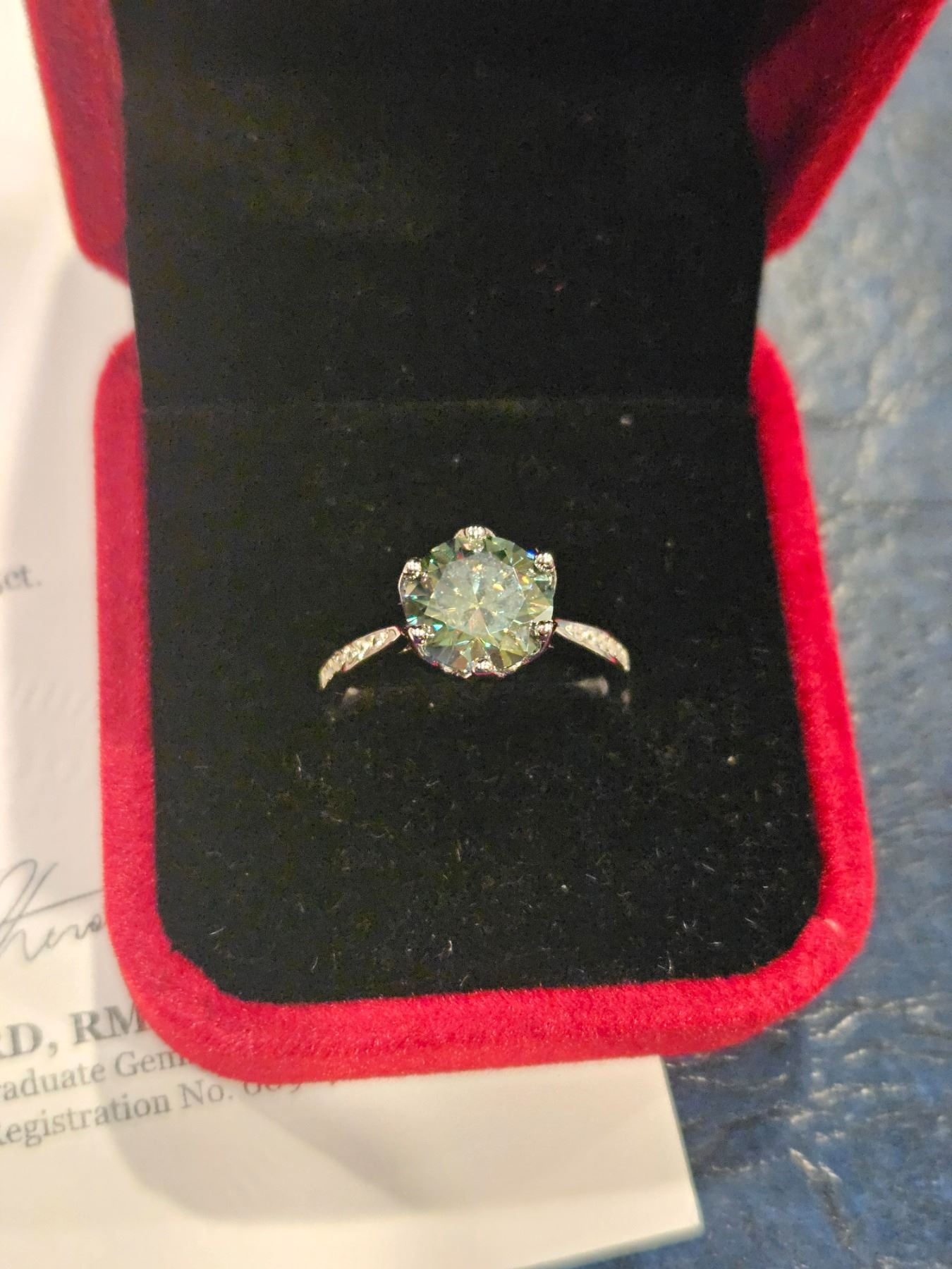 3.00 CT GRA CERTIFIED ROUND BRILLIANT CUT MOISSANITE STONE VVS VIVID BLUISH GREEN COLOR WITH 12 ROUND BRILLIANT CUT CUBIC ZIRCONIA SET IN SHANKS SET IN 925 SILVER RING SIZE 7.25 RETAIL VALUE $1,800.00