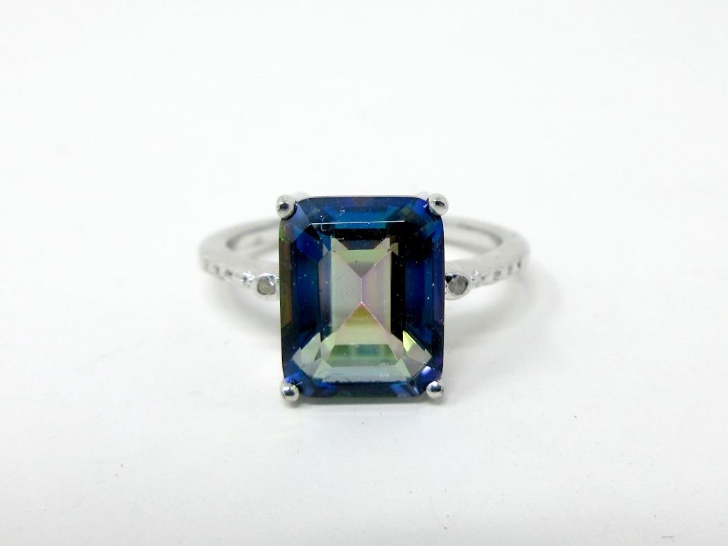 Sterling silver. Ocean blue colour topaz with 2 side diamonds. Includes $400 certificate.