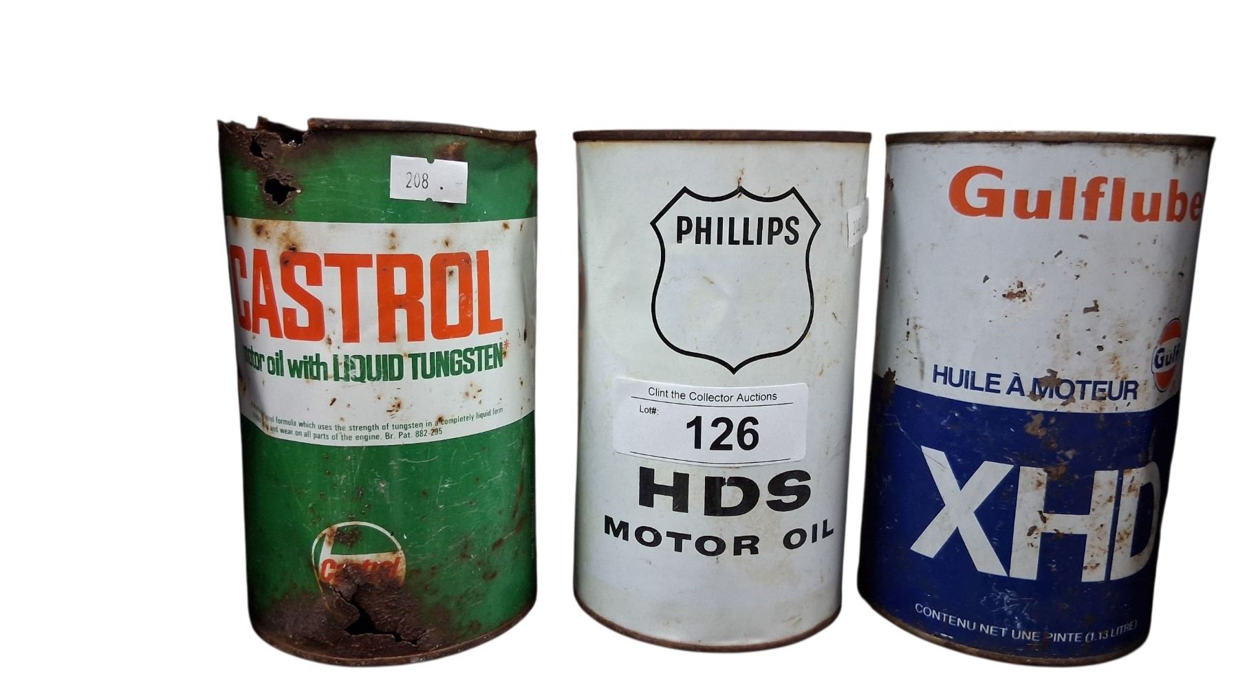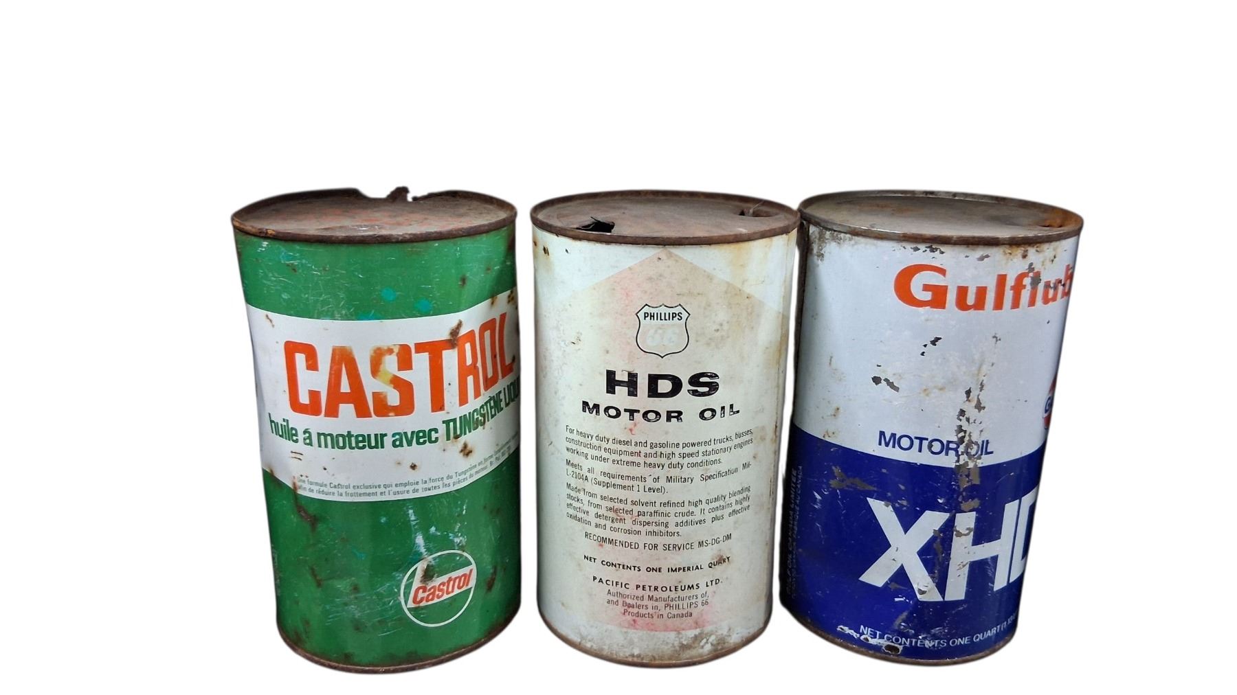 3 1 quart vintage tins Gulf, Castrol, Phillips
