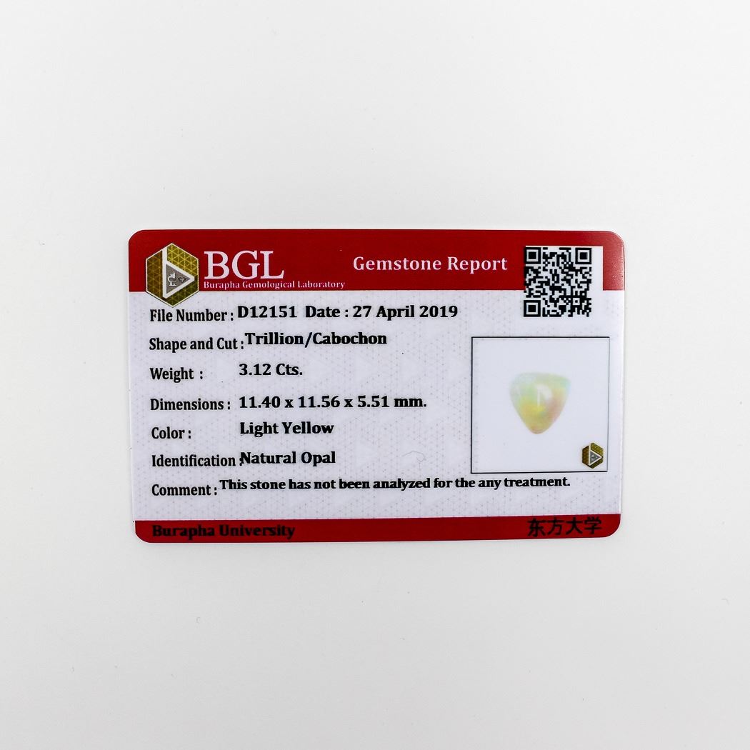 DAZZLING 3.12 CT CERTIFIED MULTI COLOR PLAY AUSTRALAIN OPAL. DISPLYING BRILLIANT BURSTS OF RED, GREEN, ORANGE AND PINK FLASHES THROUGH A TRANSLUCENT BODY. GORGEOUS TRILLIOIN CABOCHON CUT MEASURING 11.40 x 11.56 x 5.51 mm. UNHEATED . UNTREATED 100 % NATURAL . PLEASE SEE CERTIFICATION FOR FURTHER DETAILS. PICTURES CAN'T UNVEIL THE BEAUTY OF THIS HIGH GRADE OPAL.