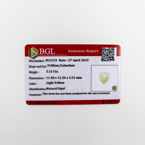 DAZZLING 3.12 CT CERTIFIED MULTI COLOR PLAY AUSTRALAIN OPAL. DISPLYING BRILLIANT BURSTS OF RED, GREEN, ORANGE AND PINK FLASHES THROUGH A TRANSLUCENT BODY. GORGEOUS TRILLIOIN CABOCHON CUT MEASURING 11.40 x 11.56 x 5.51 mm. UNHEATED . UNTREATED 100 % NATURAL . PLEASE SEE CERTIFICATION FOR FURTHER DETAILS. PICTURES CAN'T UNVEIL THE BEAUTY OF THIS HIGH GRADE OPAL.