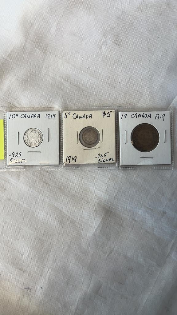 3 - 1919 COINS - 10 CENT, RARE 5 CENT (.925) AND LARGE CENT