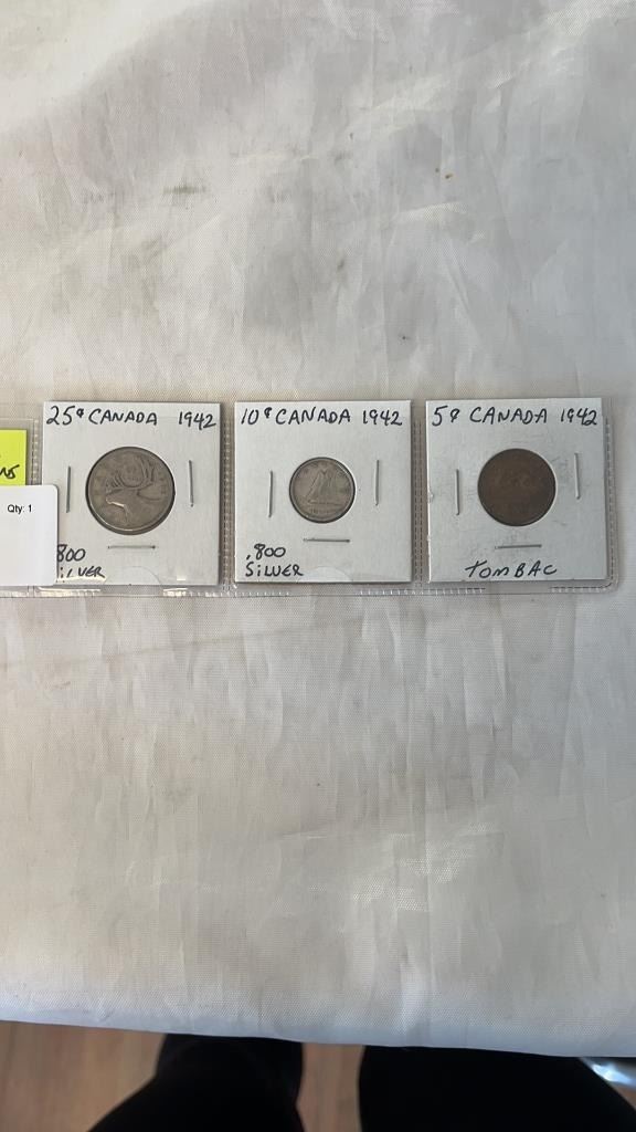 3- 1942 CANADIAN COINS WAR-TIME 25 CENT, 10 CENT .800 SILVER PLUS TOMBAC 5 CENT