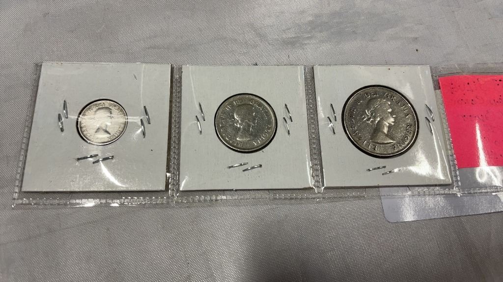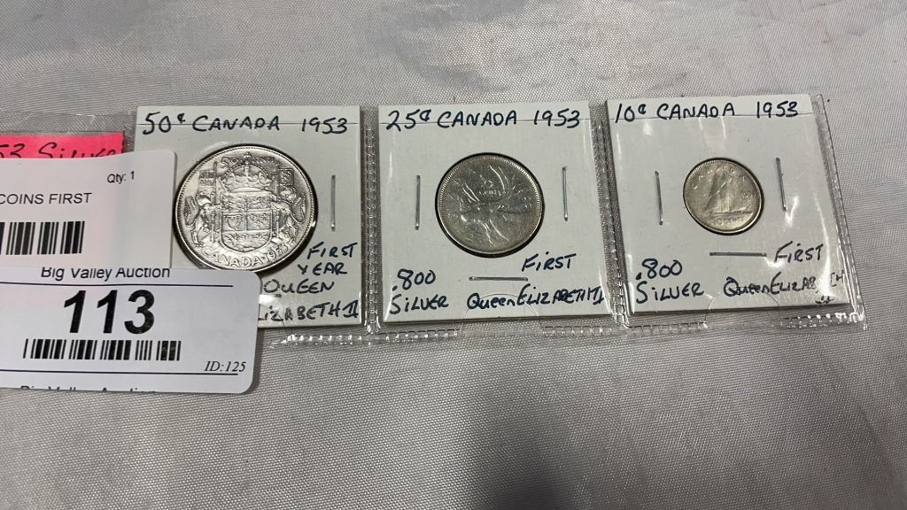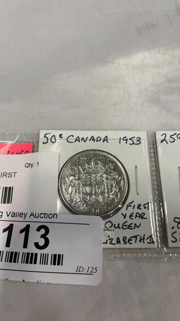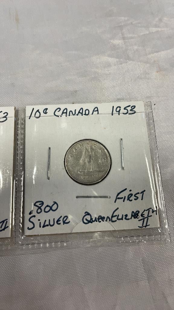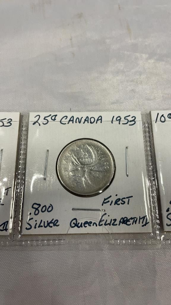 3 1953 SILVER CANADIAN COINS FIRST YEAR QUEEN ELIZABETH II - 50 CENT, 25 CENT, 10 CENT .800 SILVER