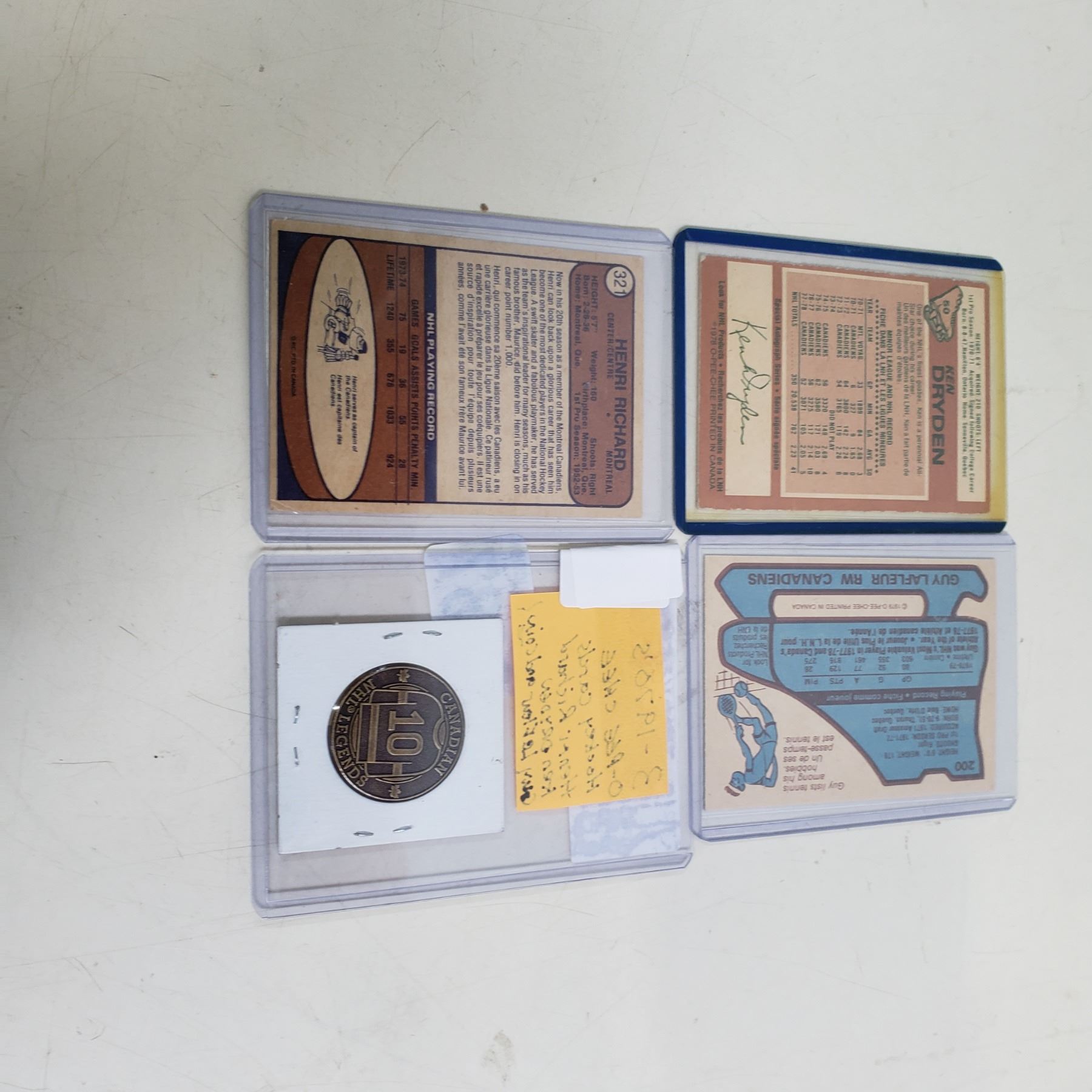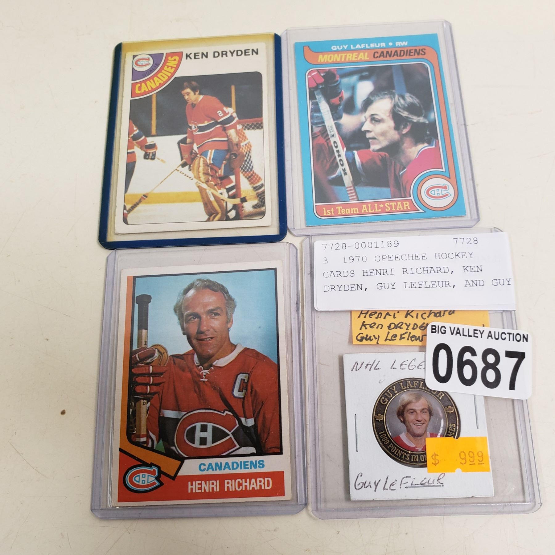 3 1970 OPEECHEE HOCKEY CARDS HENRI RICHARD, KEN DRYDEN, GUY LEFLEUR, AND GUY LEFLEUR COIN