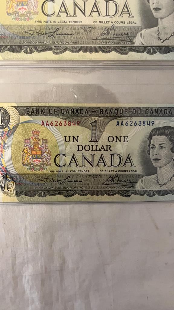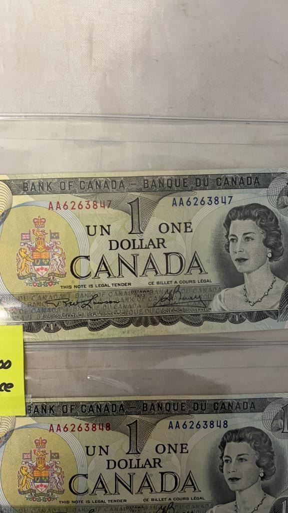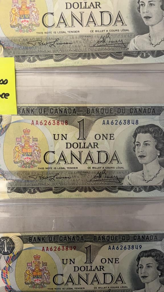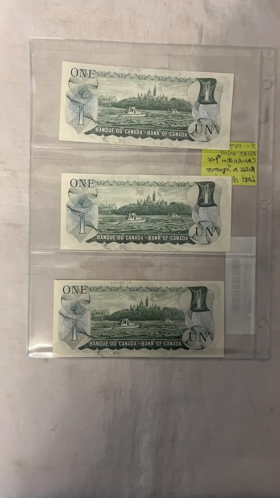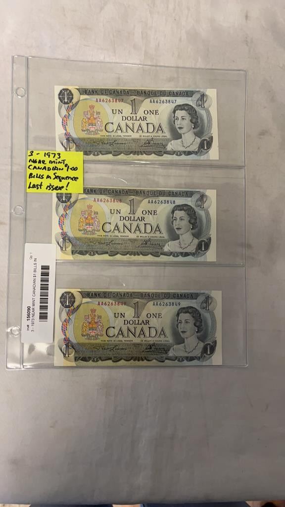 3 - 1973 NEAR MINT CANADIAN $1 BILLS IN SEQUENCE - LAST ISSUES