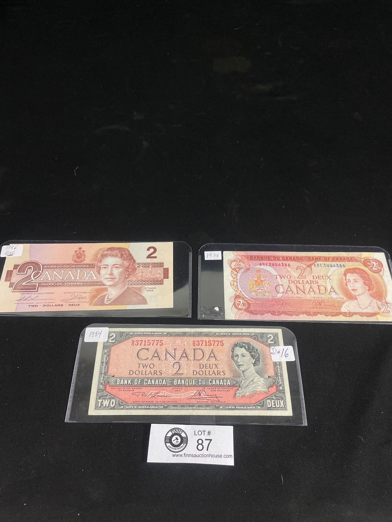 3 $2 Canadian Bills, 1954, 1974, 1986 (Uncirculated)