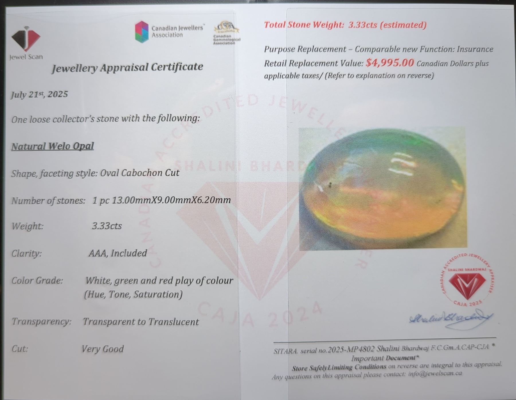 3.33 ct Certified Opal gemstone ($4,995 Appraisal)
