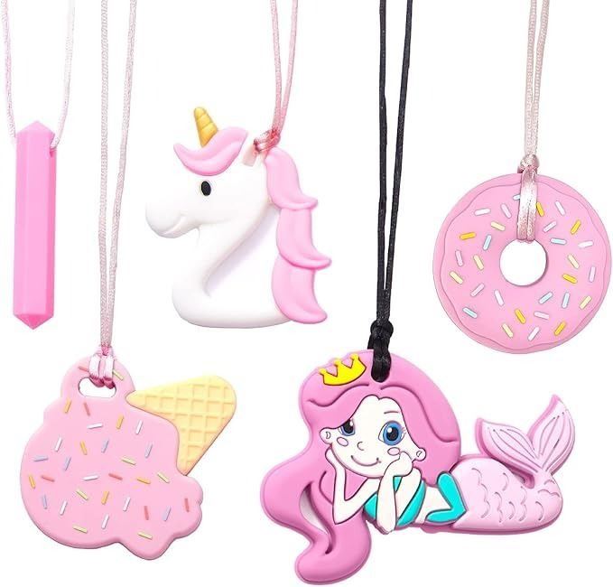 - Chew Necklaces for Sensory Kids; 5 PCS Silicone Chewable Necklaces for Kids or Adults That Like Biting or Have Sensory Issues -Perfectly Textured Silicone Baby Teether Chewy Toys-Chewy Necklace Sensory Toys