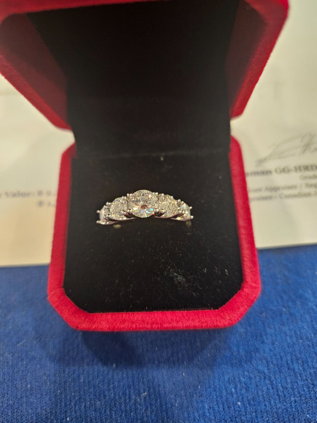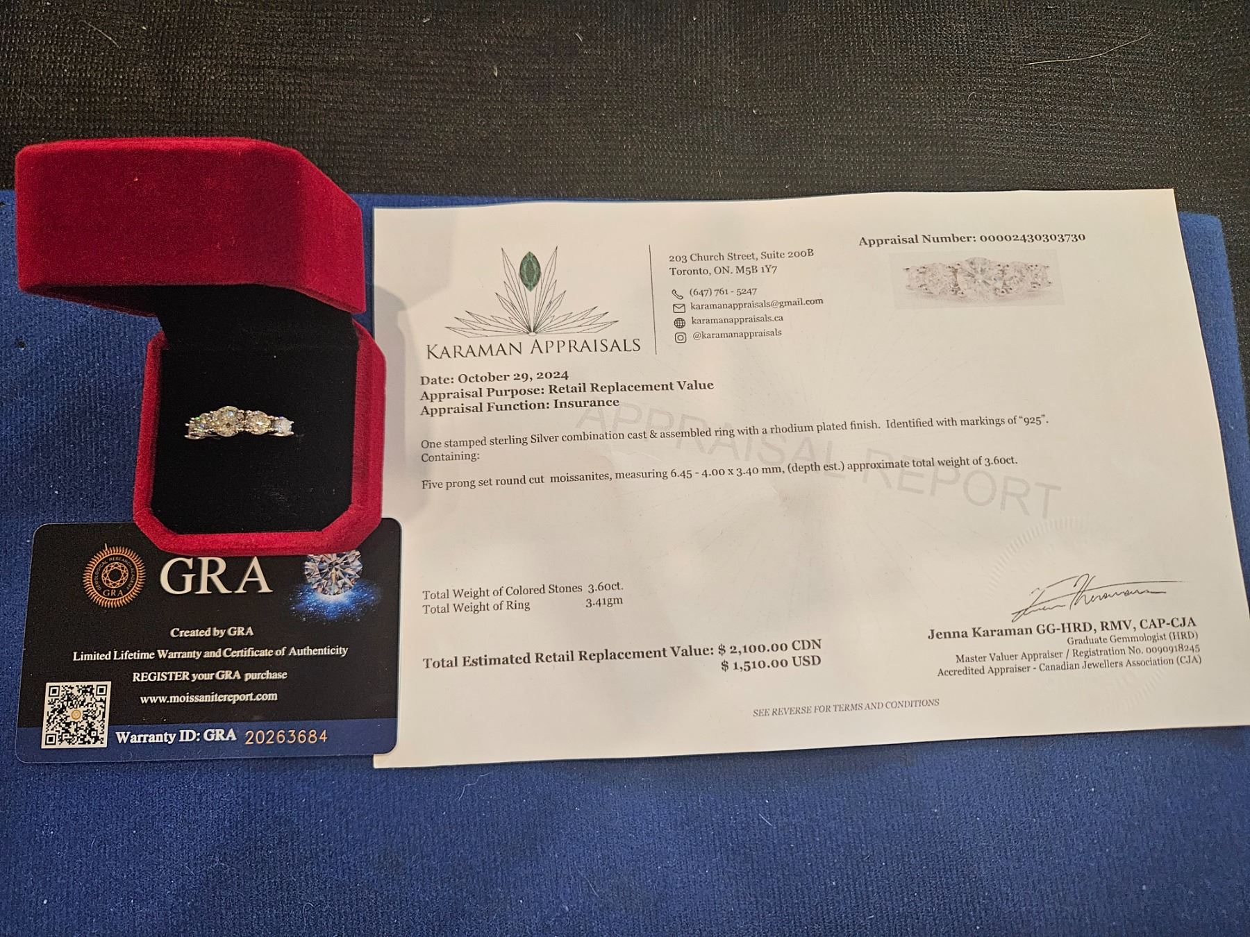 3.60 CT TW GRA CERTIFIED ROUND BRILLIANT CUT MOISSANITE STONE VVS D COLOR WITH THE 5 MOISSANITE STONES SET GRADUATING DOWN IN SIZE FROM CENTER SET IN 925 SILVER RING SIZE 6 RETAIL VALUE $2,100.00