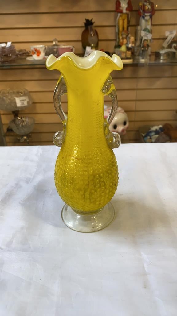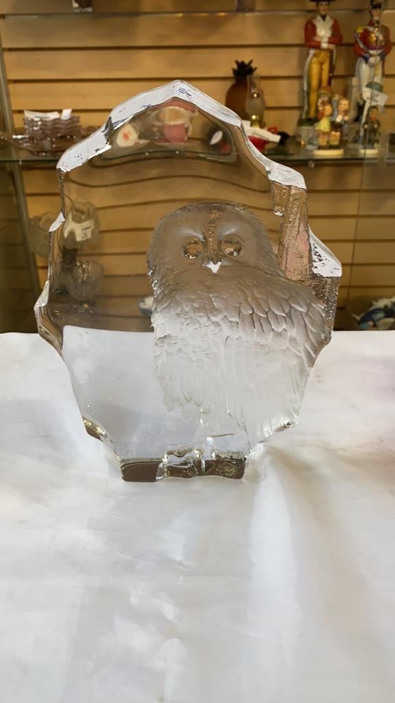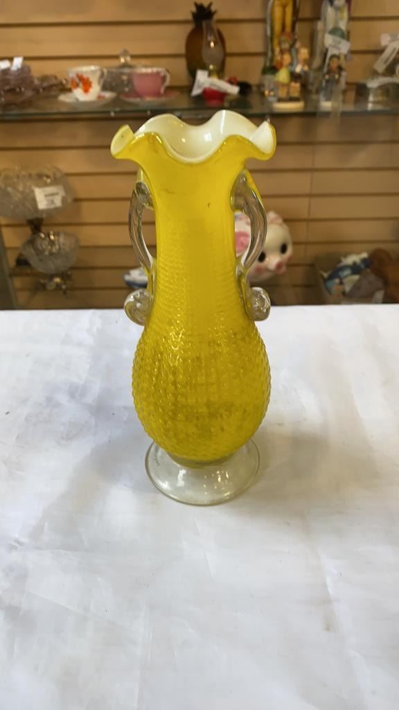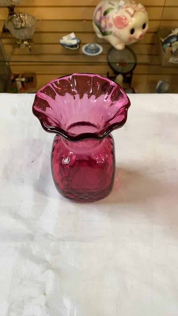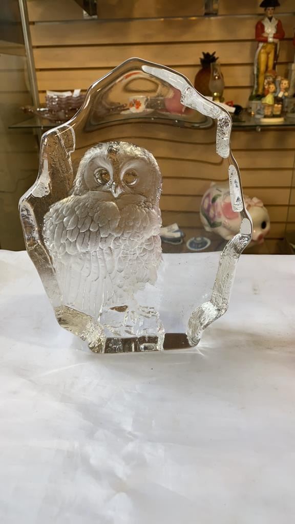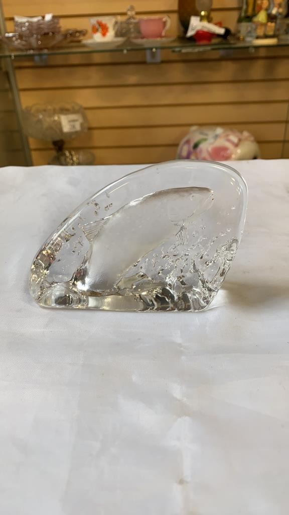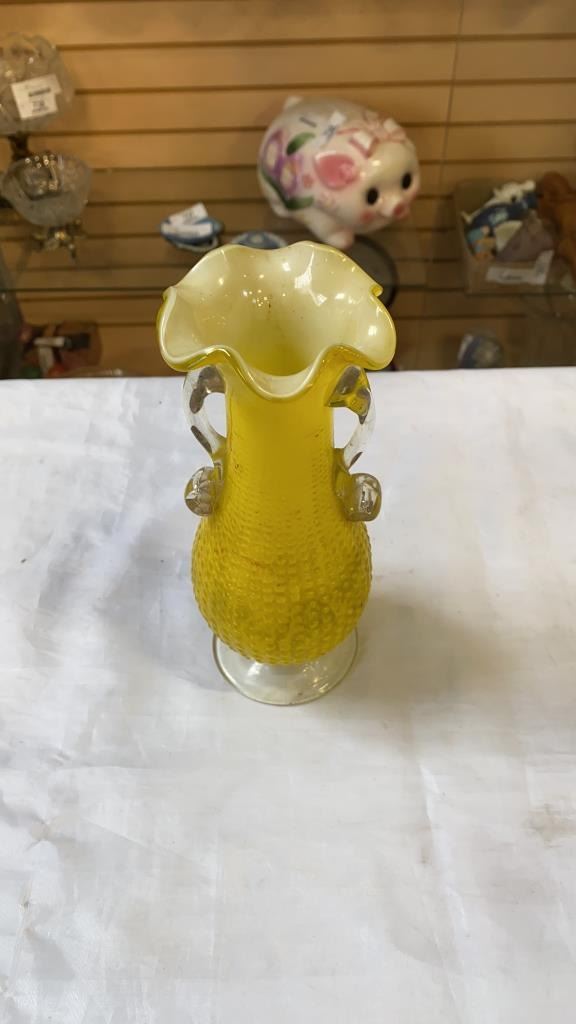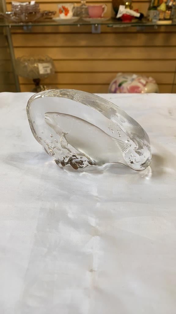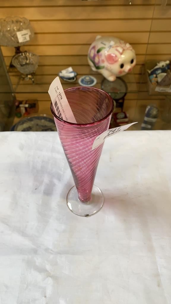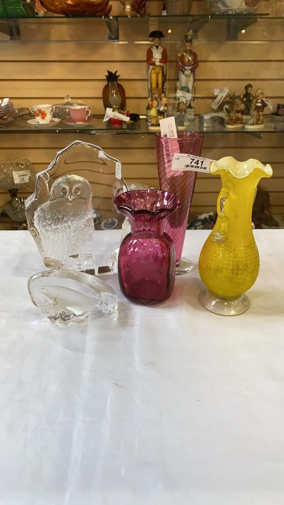 3 ART GLASS VASES AND 2 GLASS DECORATIONS