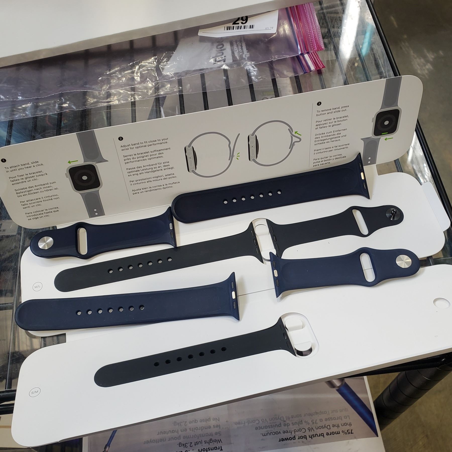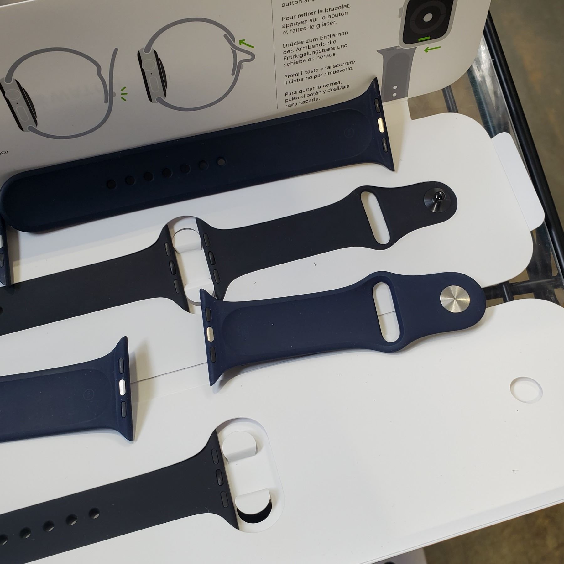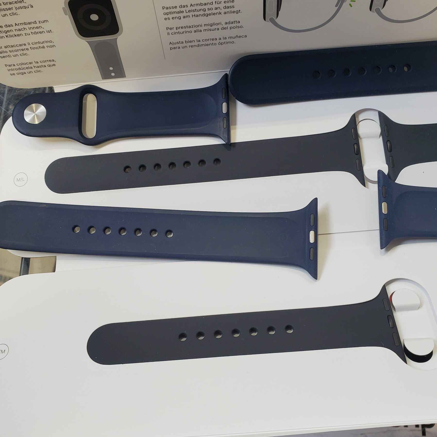 3 AS NEW 44MM APPLE WATCH BANDS - ONE BLACK, TWO NAVY SPORT BANDS