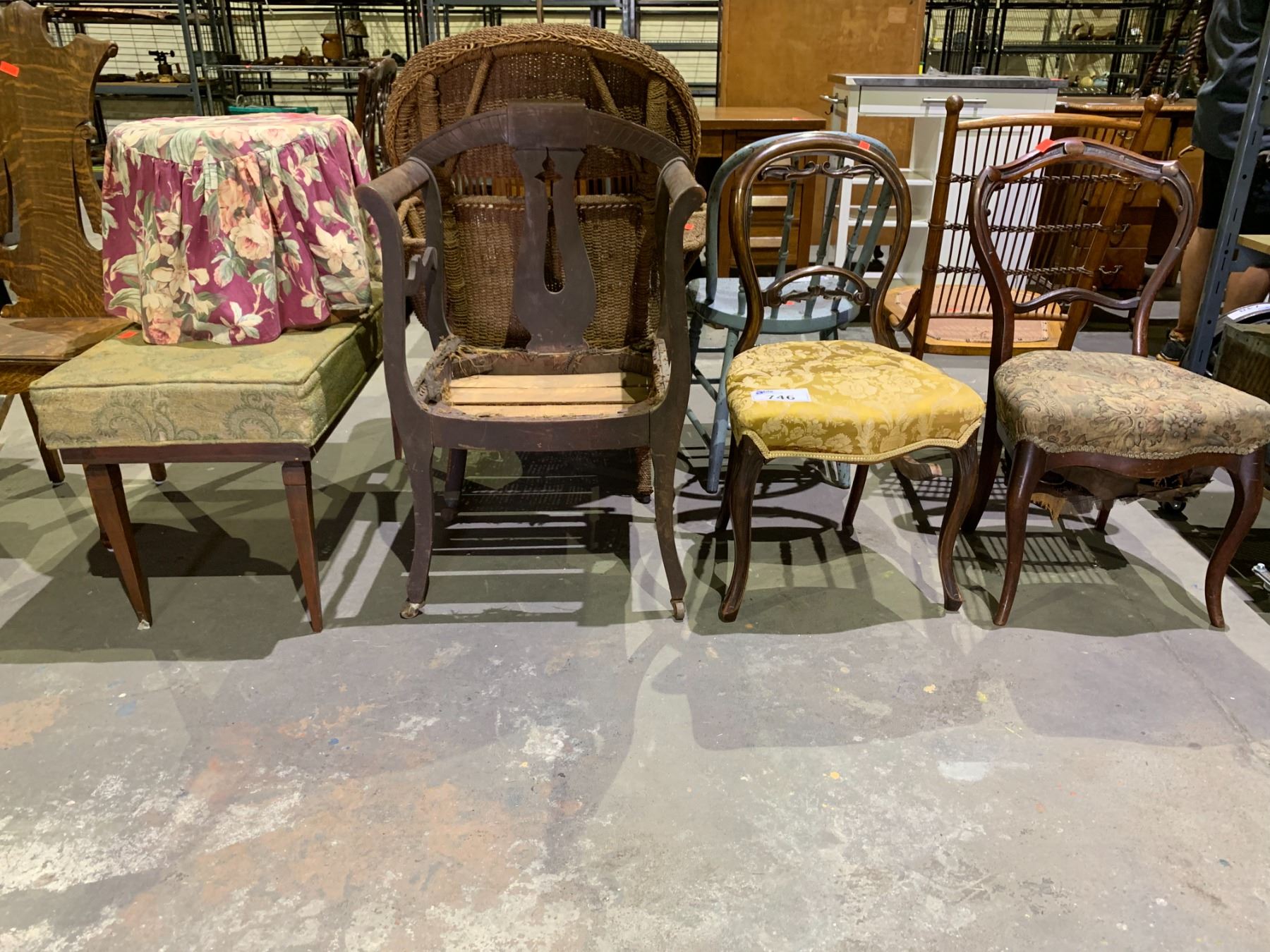 3 ASSORTED CHAIRS, WOODEN BENCH & STORAGE OTTOMAN