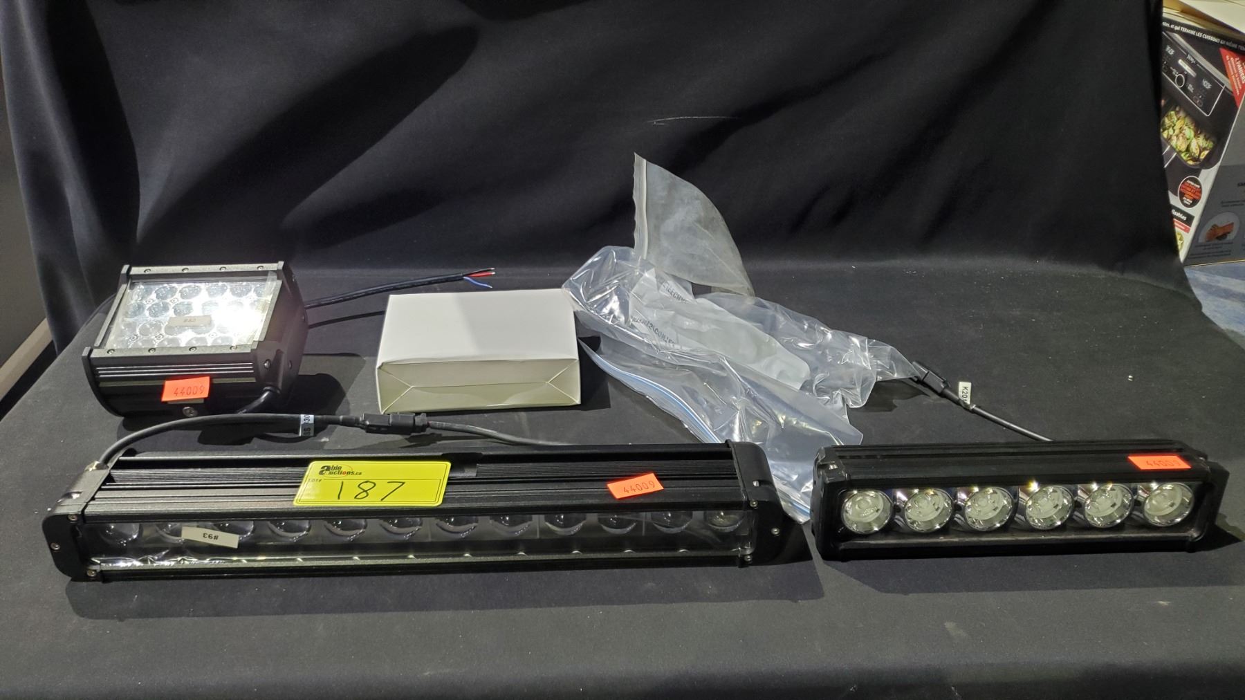 3 ASSORTED SIZE LED OFF ROAD LIGHTS WITH SOME HARDWARE