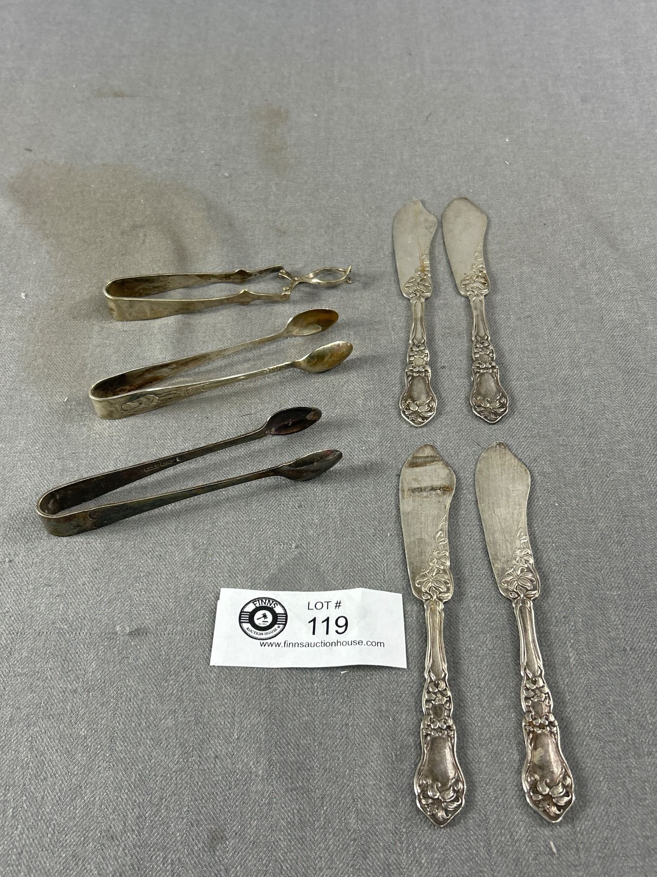 3 Antique Silverplated Sugar Tongs & Wm. Rogers & Son Butter Knives Set