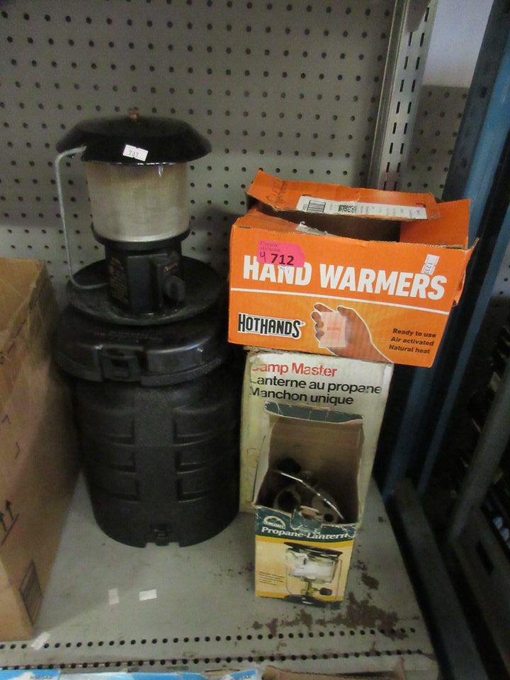 3 Assorted Camping Lanterns & Box of Hand Warmers