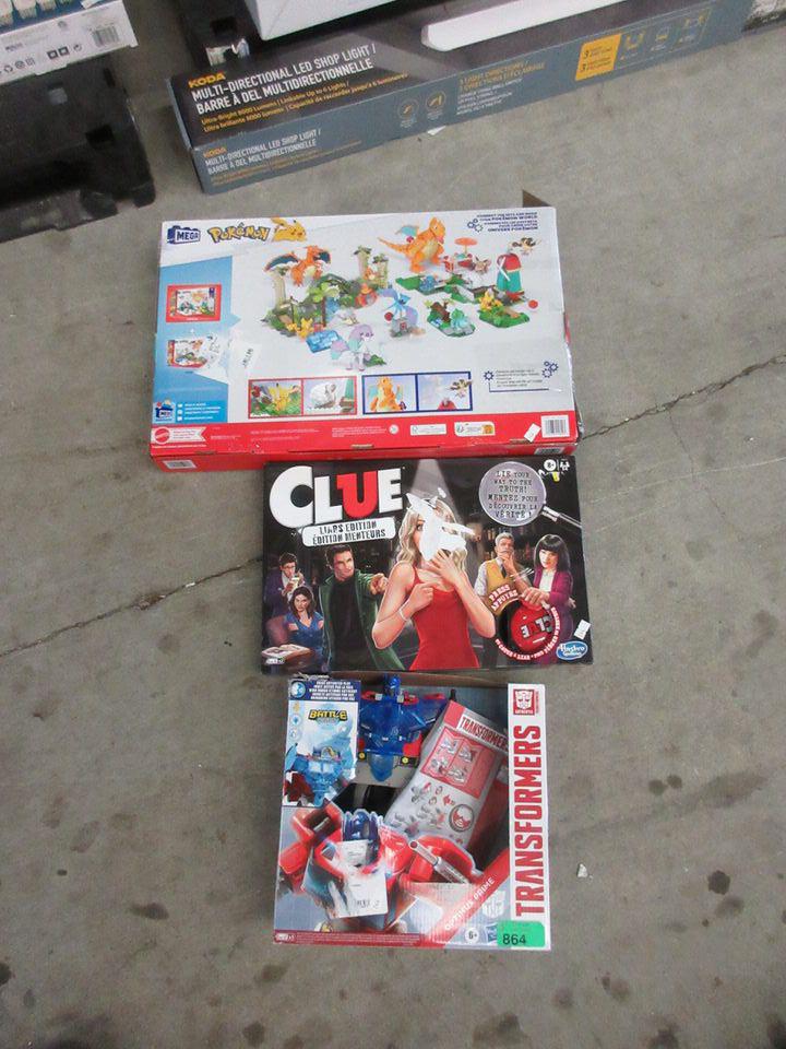 Transformers Optimus Prime, Clue board game, Mega Pokemon building toy.
