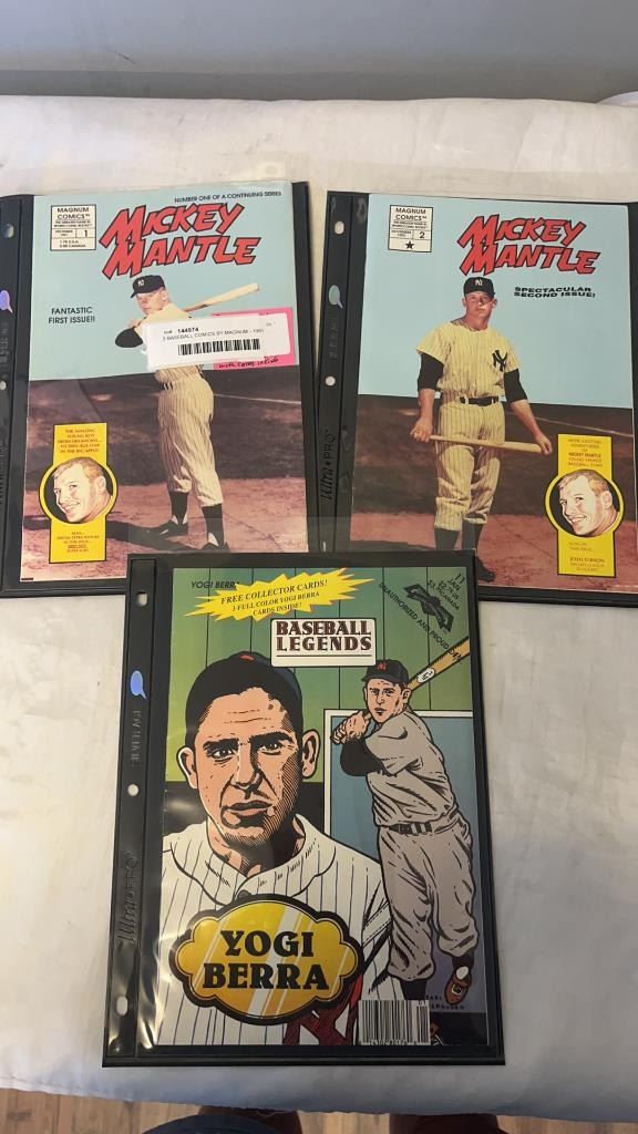 3 BASEBALL COMICS BY MAGNUM - 1991 MICKEY MANTLE (VOL 1) 1992 MICKEY MANTLE (VOL 2) ; YOGI BERRA COLIC WITH CARDS INSIDE