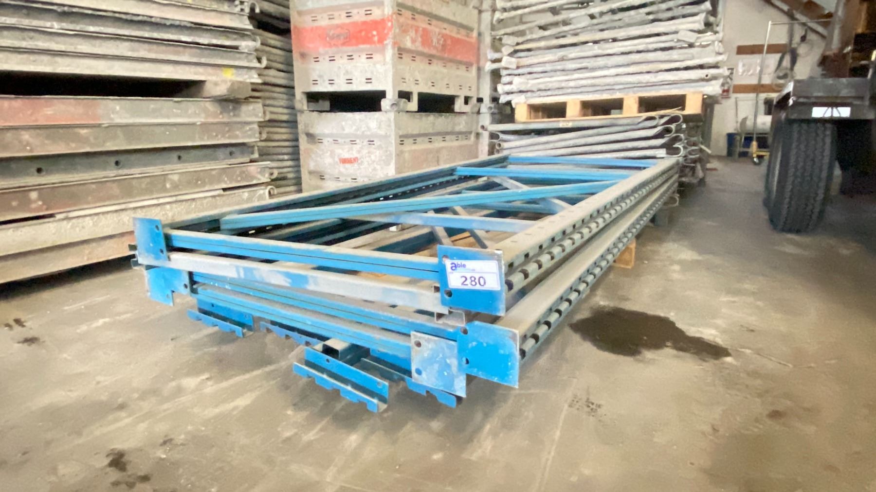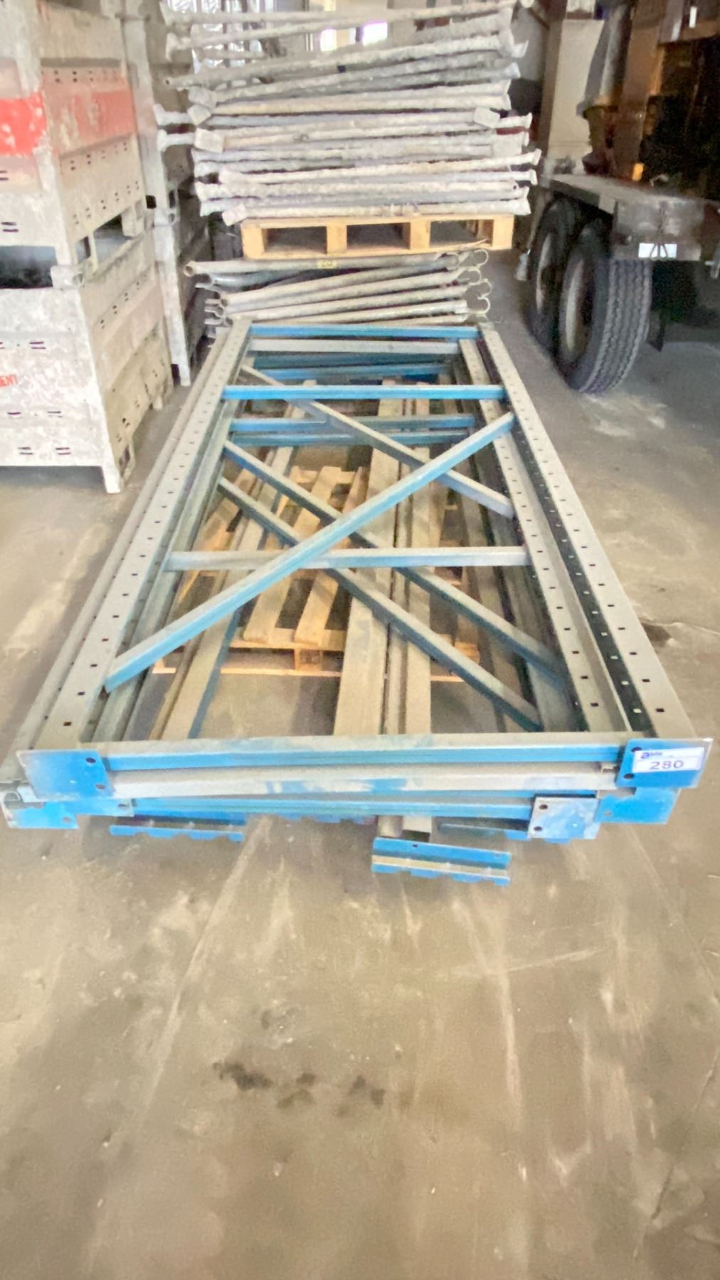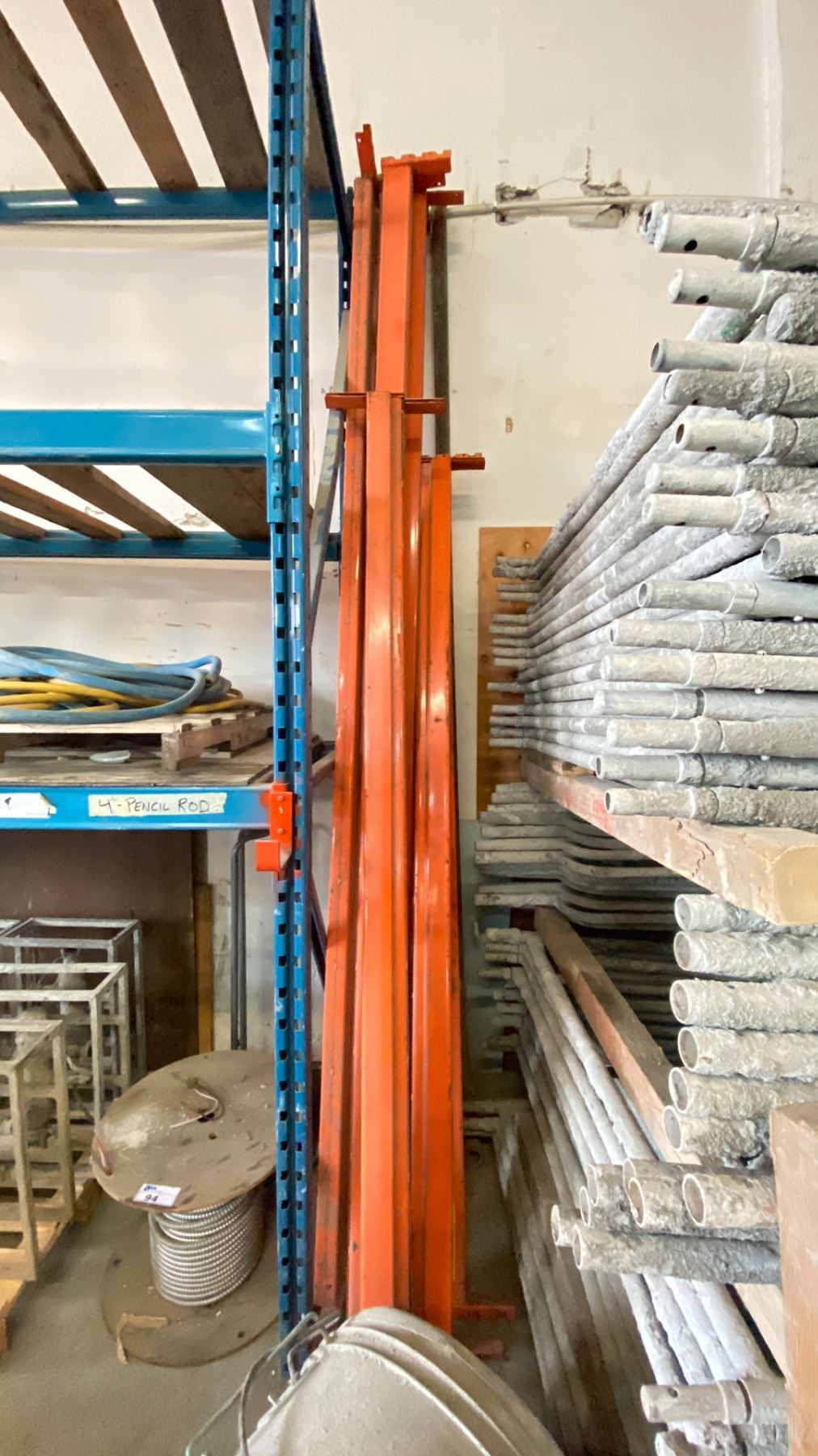3 BAYS OF BLUE AND ORANGE INDUSTRIAL PALLET RACKING (DISASSEMBLED) - 4 BLUE UPRIGHTS/4 BLUE SIDE RAILS AND 10 ORANGE ASSORTED SIZE SIDE RAILS