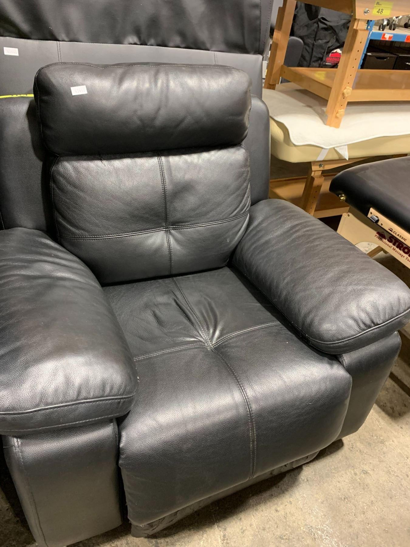 3 BLACK LEATHER LOOK OVERSTUFFED RECLINING ARMCHAIRS ( SOME COSMETIC DAMAGE RECLINER WORKING )