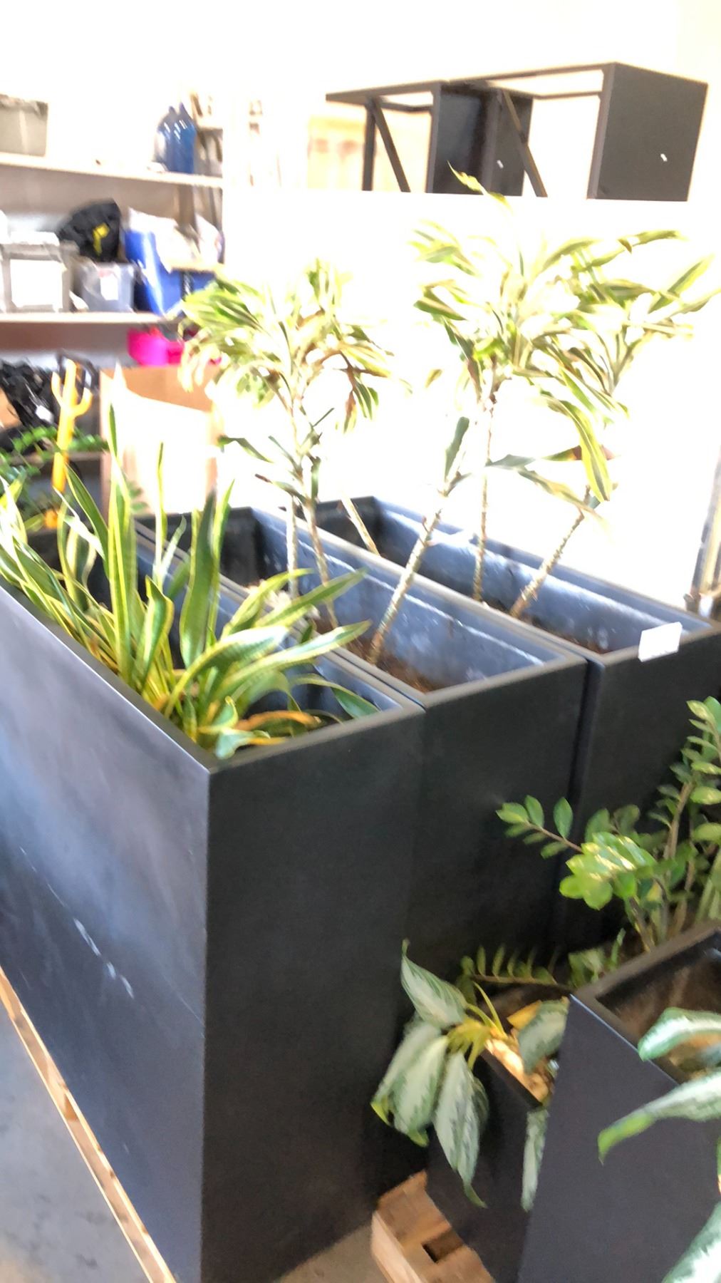 3 BLACK PLASTIC PLANTER BOXES D14" X W44" X H40" - WITH PLANTS