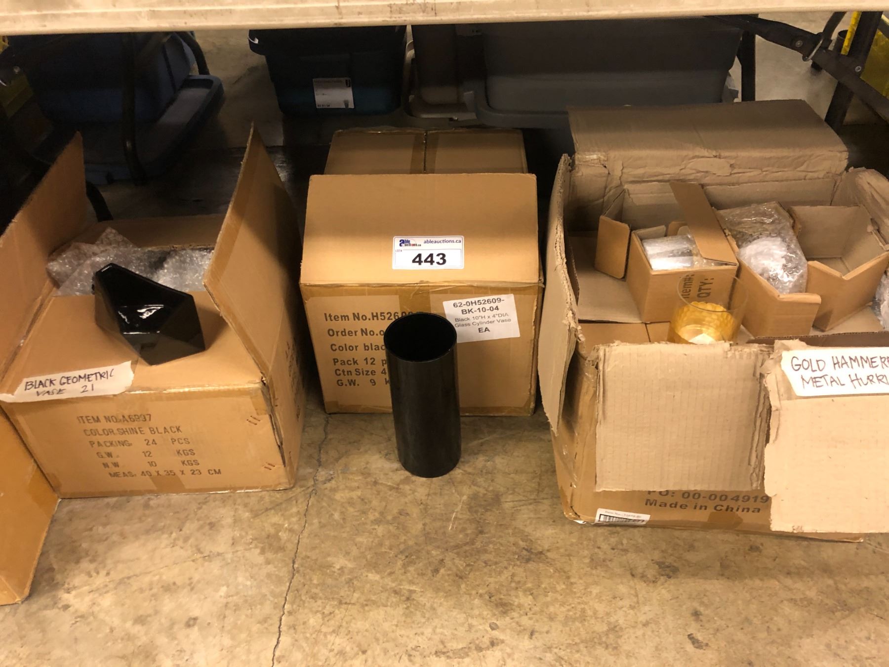 3 BOXES OF ASSORTED BLACK AND CLEAR VASES/CANDLE HOLDERS