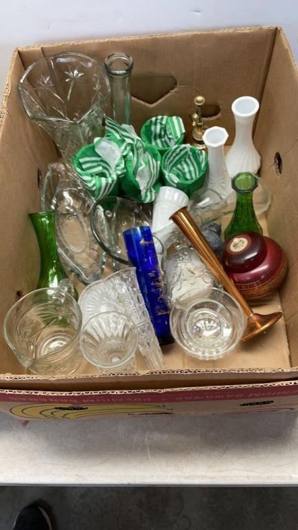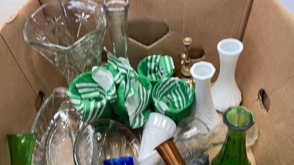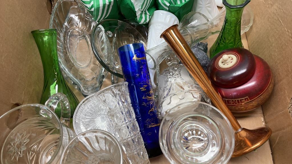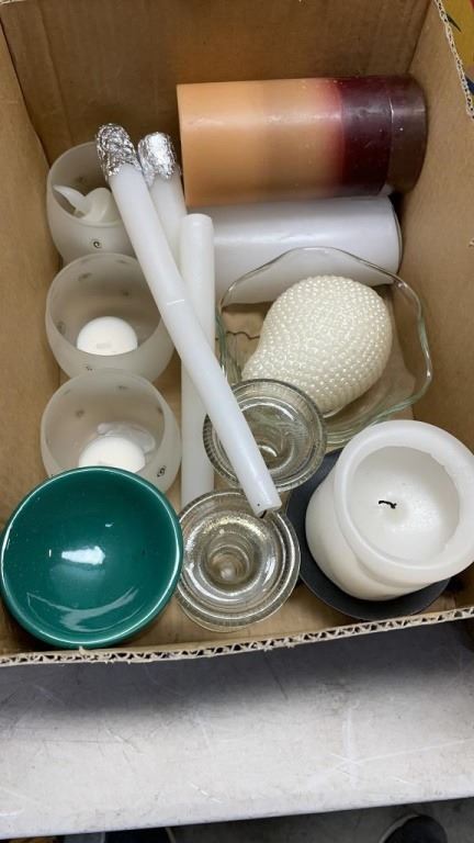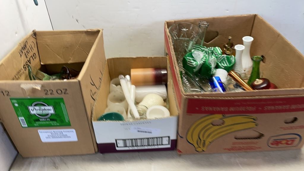 3 BOXES OF CRYSTAL, VASES AND CANDLES