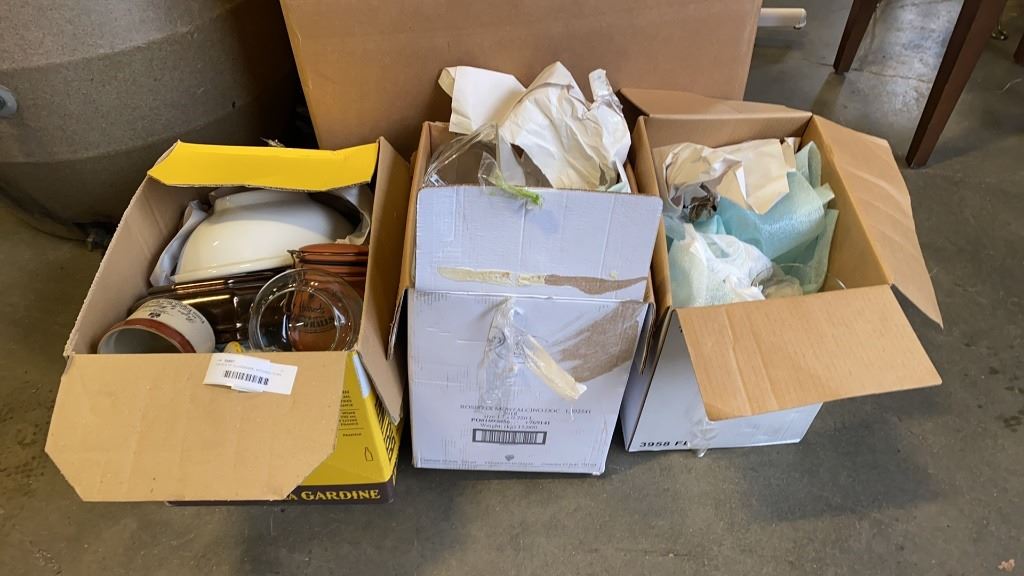 3 BOXES OF GLASSWARE, KITCHEN ITEMS, CANNISTER, ETC
