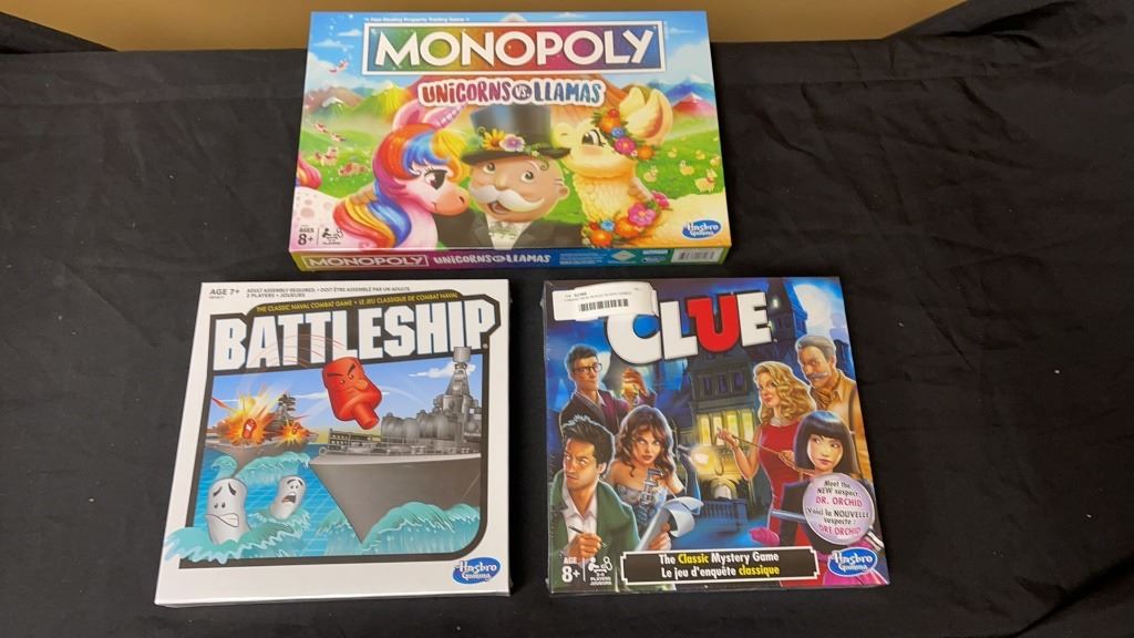 3 BRAND NEW SEALED BOARD GAMES - MONOPOLY UNICORNS VS LLAMAS, BATTLESHIP, AND CLUE