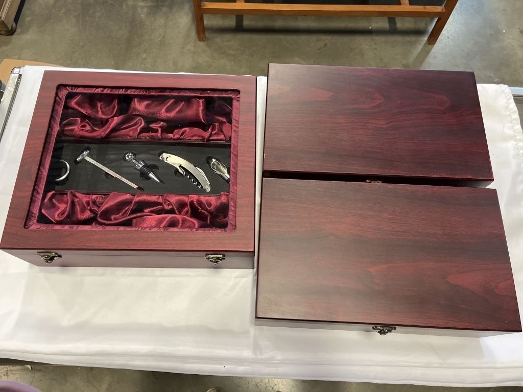 3 BRAND NEW WINE GIFT BOXES - (2) 2 BOTTLE WINE HOLDER W/ CORKSCREW, BOTTLE STOPPER, POURER, THERMOMETER, FOIL CUTTER, AND DRIP RING AND (1) 2 BOTTLE WINE HOLDER W/ CORKSCREW, POURER, THERMOMETER, AND DRIP RING